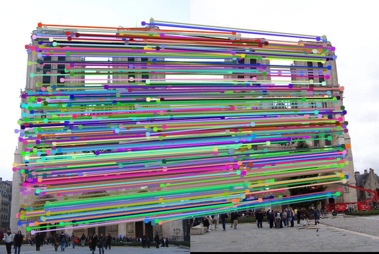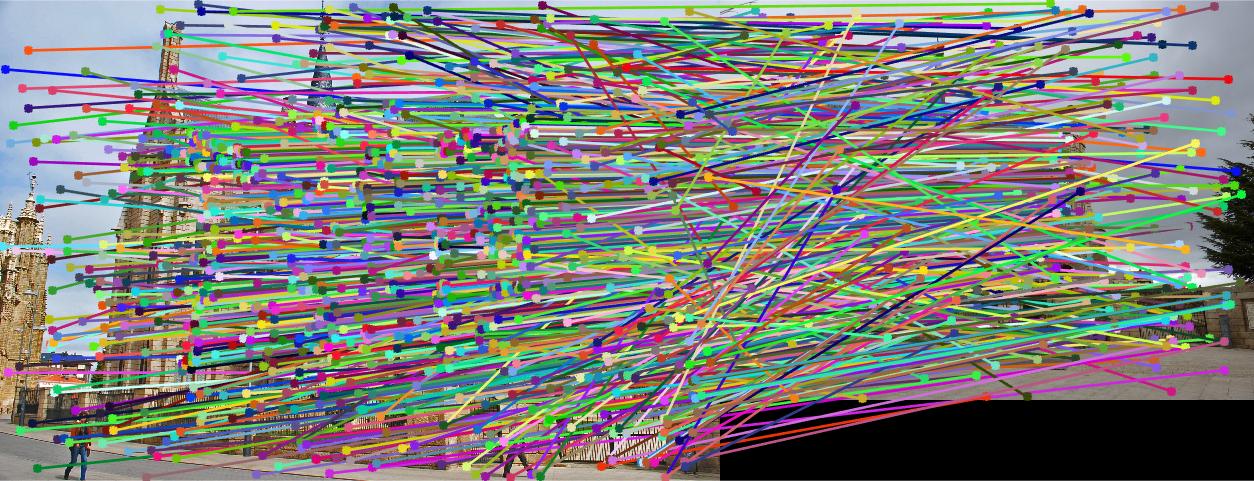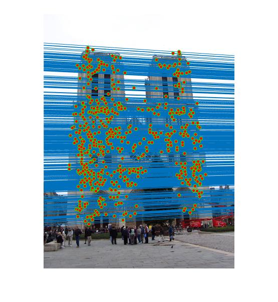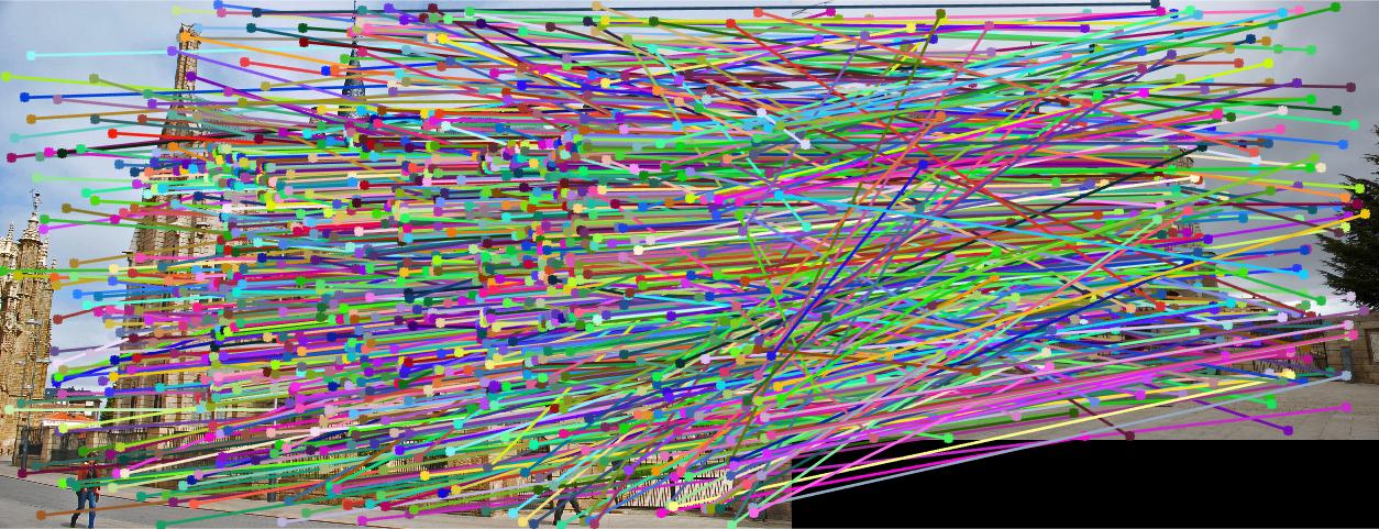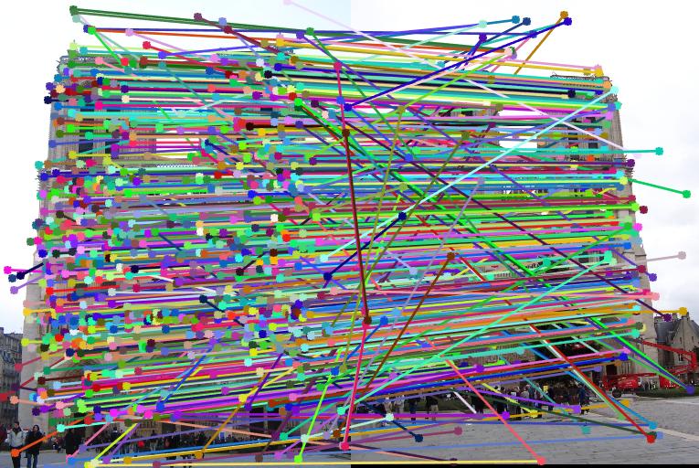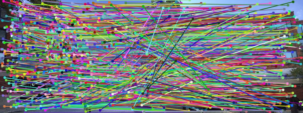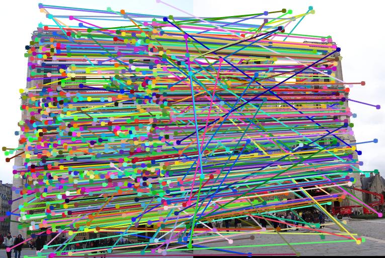 Image 1 showing the results of the correspondences before performing the RANSAC. Image 2 showing the results of the correspondences after performing the RANSAC. This was run for 10000 iterations of RANSAC, thus giving dense correspondences. |