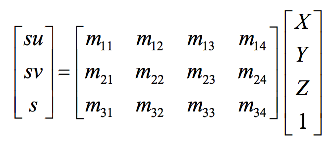 The camera projection matrix contains the camera parameters such as the focal point or the camera center. This matrix satisfies the equation: