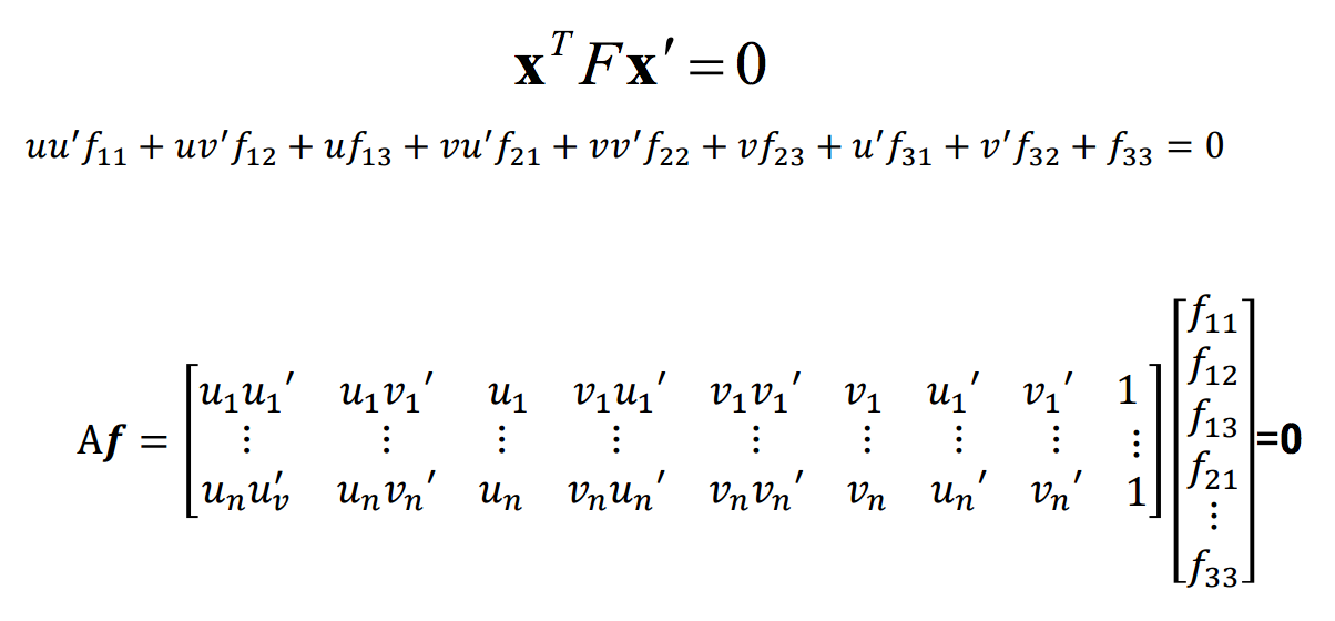Now, because the fundamental matrix is a rank 2 matrix. We need to reduce the rank of F. To do this, we decompose F into U(Sigma)V, clear out the smallest singular value in Sigma (setting it to zero) and multiply them back together for the rank-2 matrix F.