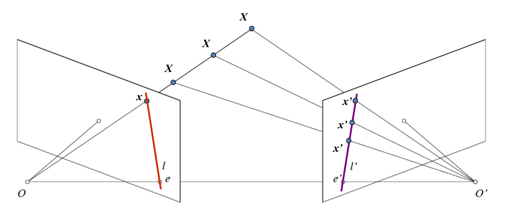 As seen above, by using the fundamental matrix and a given point, x, on one image plane, we can figure out where the same point in the other image, x', belongs by calculating a line that it belongs on, l'.