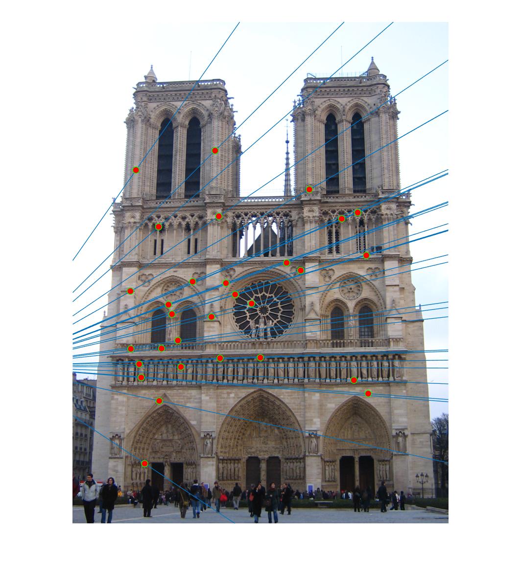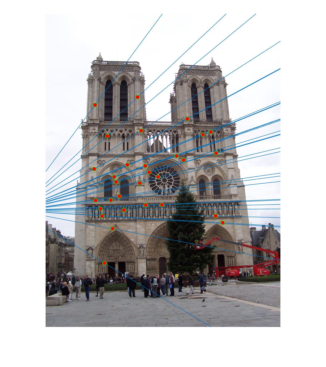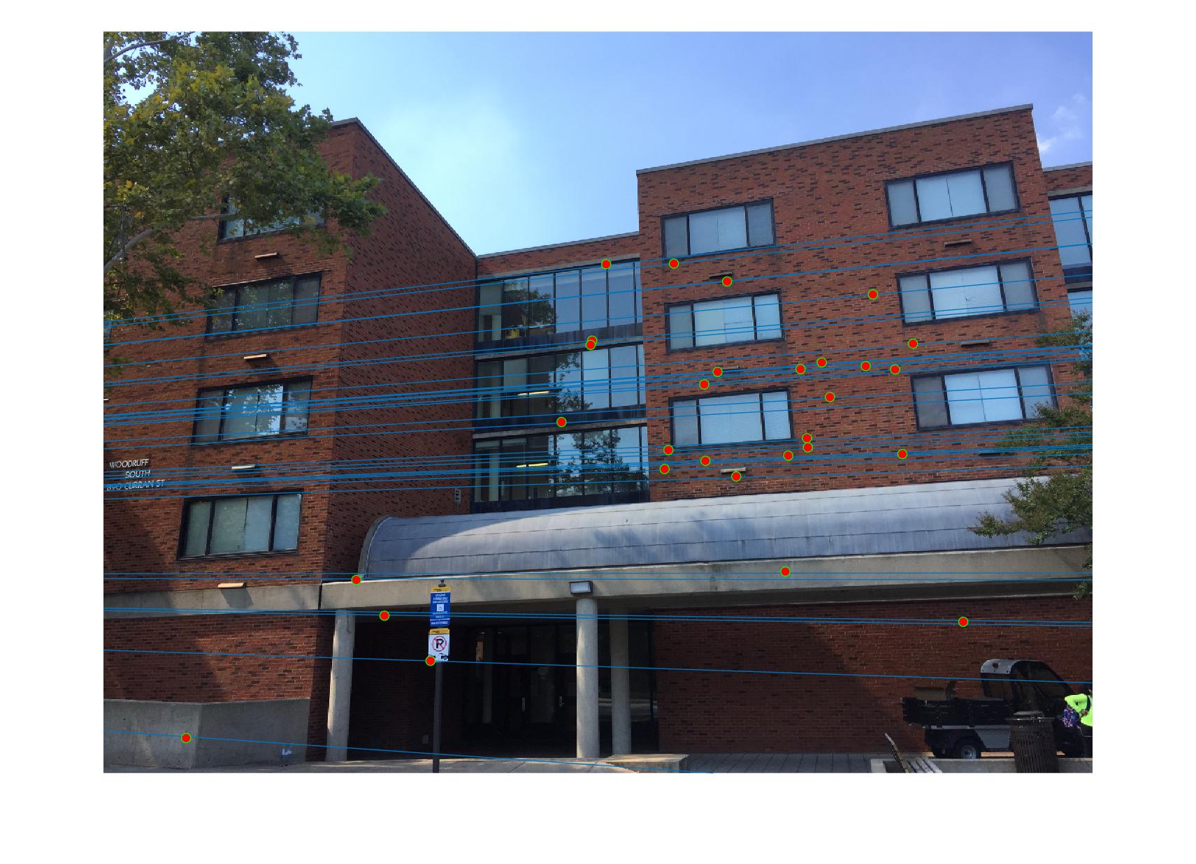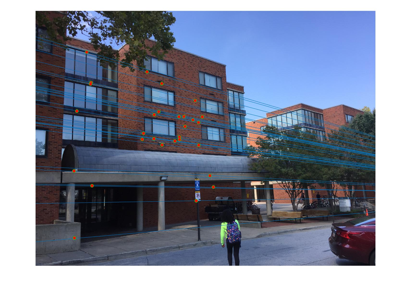 Finally, I decided it to limit the results to only 30 entries so that i can create an uncluttered visualization of the epipolar lines. I originally decided to take the first 30 as the subset of points for my diagram because I thought that since they all are good candidates due to being lower than the threshold or delta, and thus would yield good results. Thus it wouldn't matter which 30 points to take. However, I realized that these points are usually clustered together, and are not randomly placed throughout the image, and thus most of the matches that we see in the results below are usually around the same region, which is why I ended up randomly sampling for 30 points.