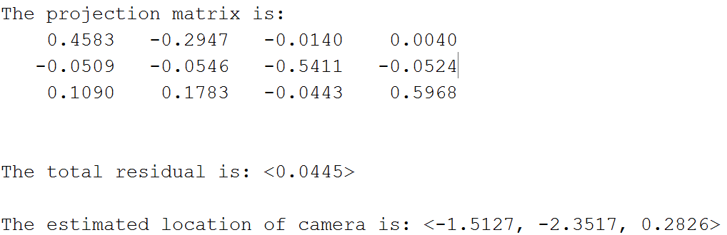 Above were the results I got after running the projection matrix, and camera center calculations. Overall, it was nearly identical to the expected results including some rounding calculations. The only thing different was that my projection matrix was a scalar multiple of the expected results by a factor of -1, which is still deemed correct by the instructions.