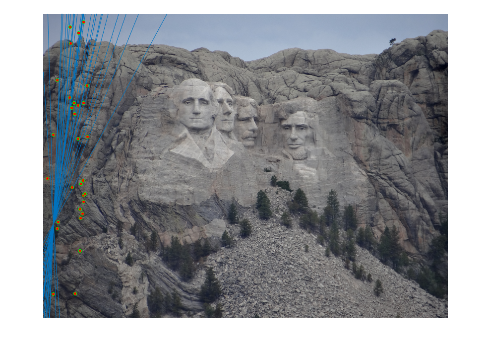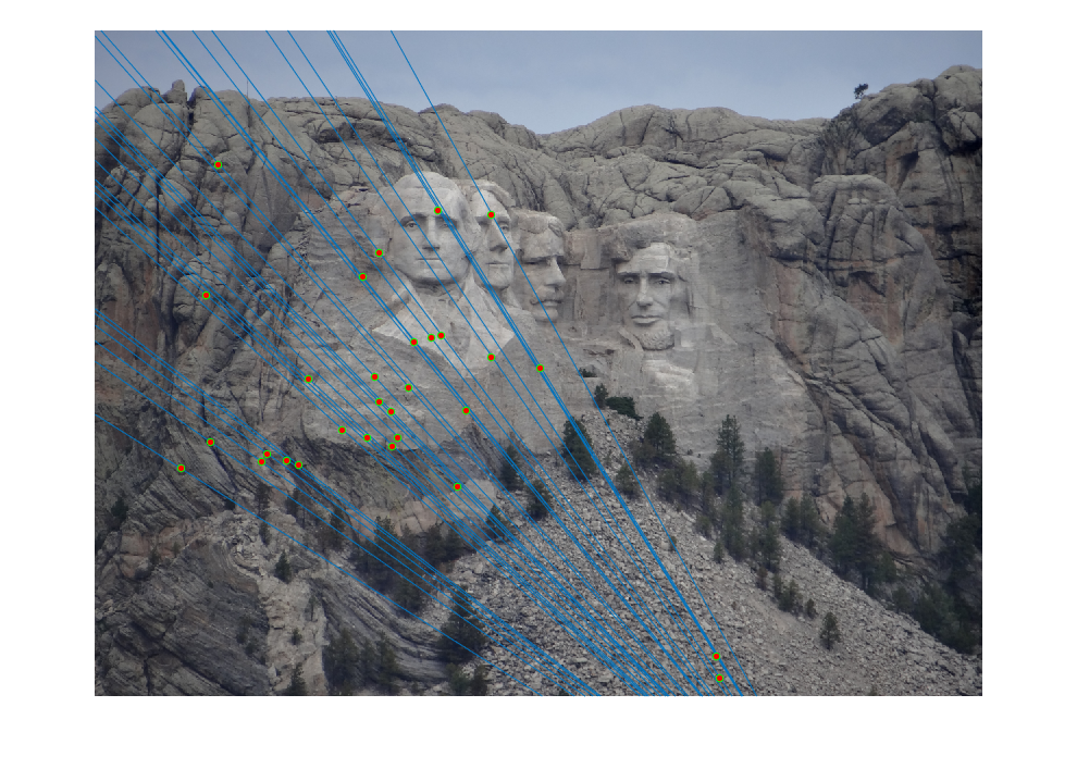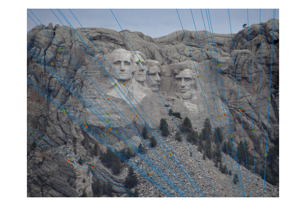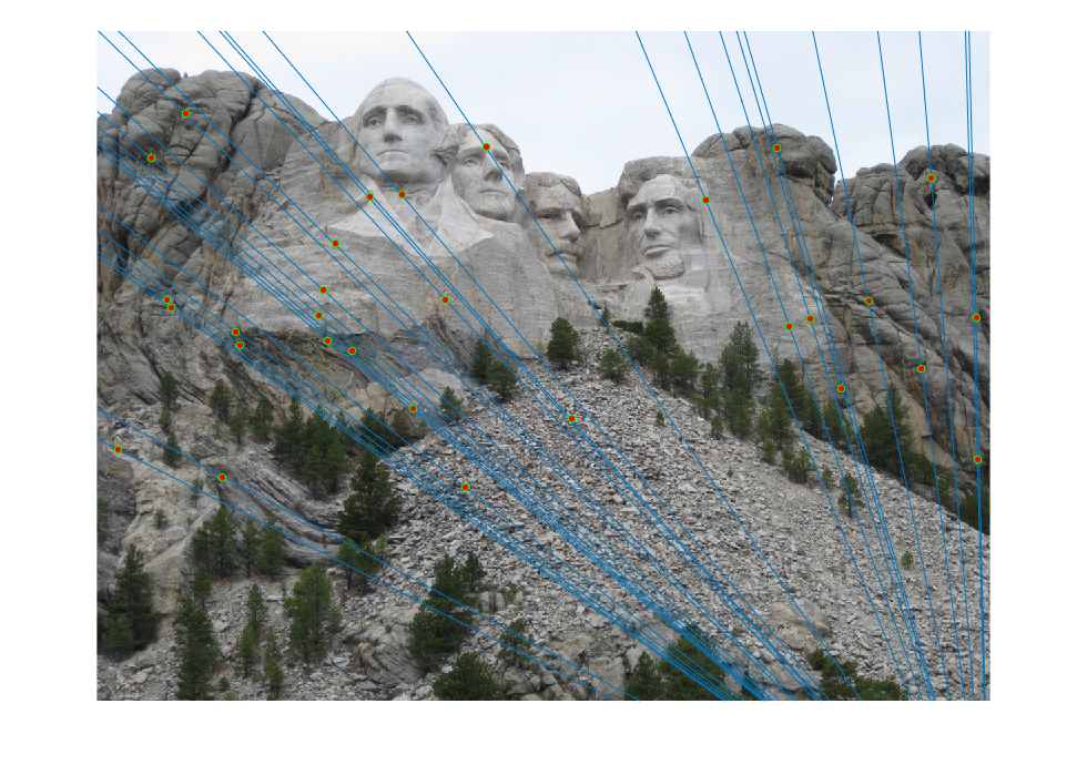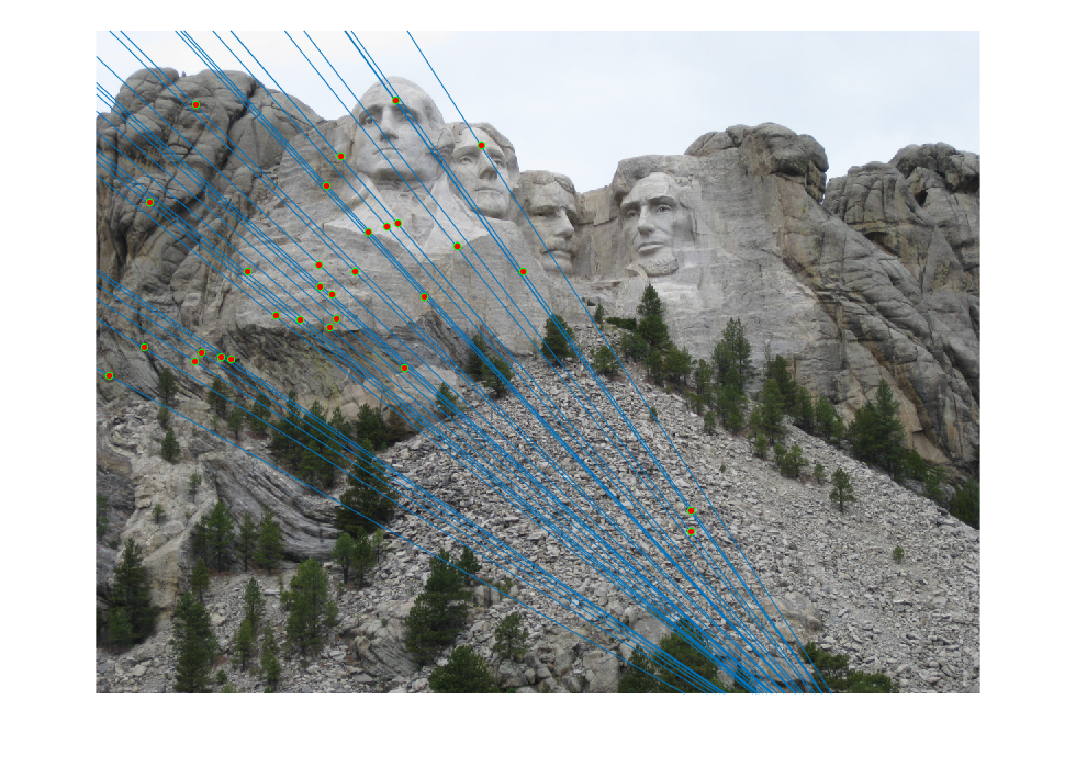 Fig.10: Epipolar lines for the fundamental matrix F estimated without RANSAC for Mount Rushmore image pair. |