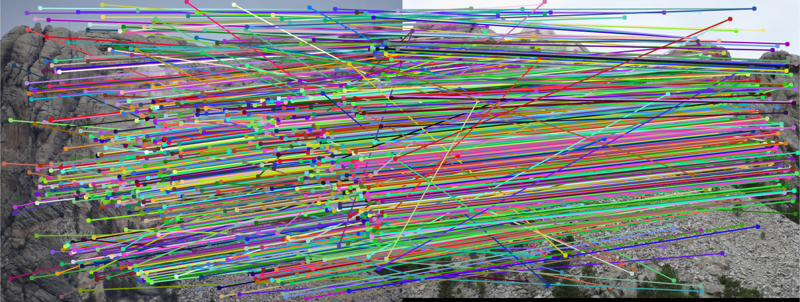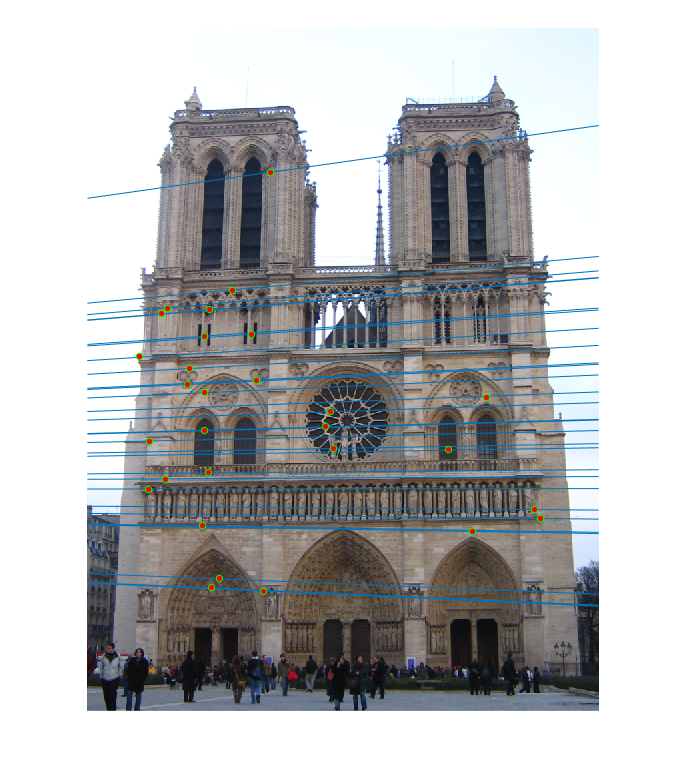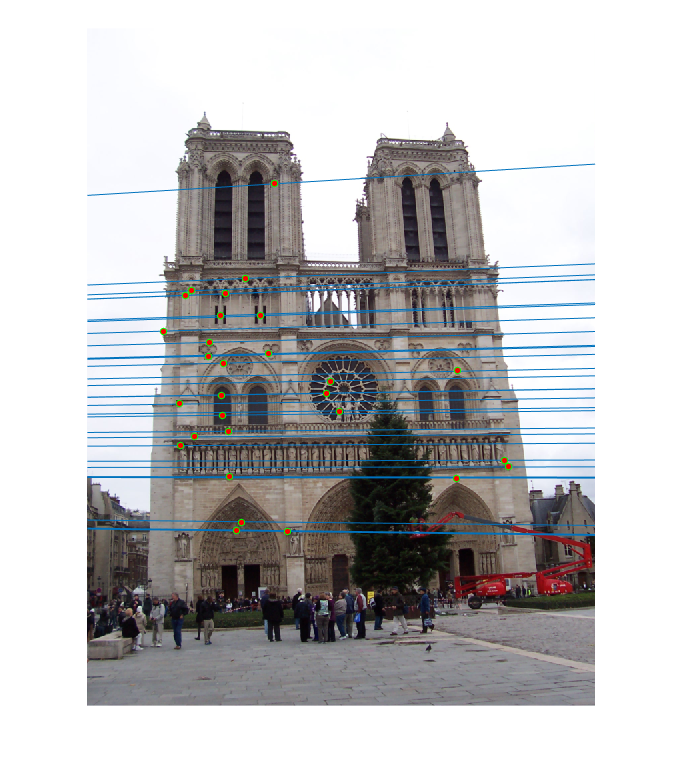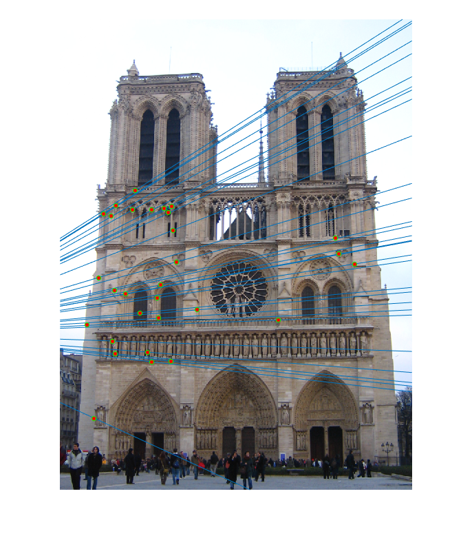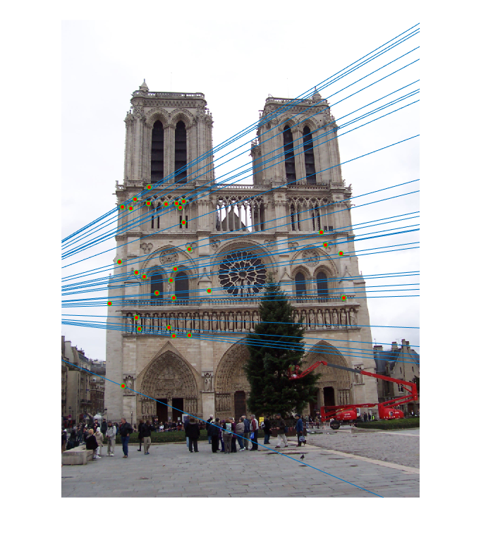 Fig.10: Epipolar lines for the fundamental matrix F estimated without RANSAC for Mount Rushmore image pair. |