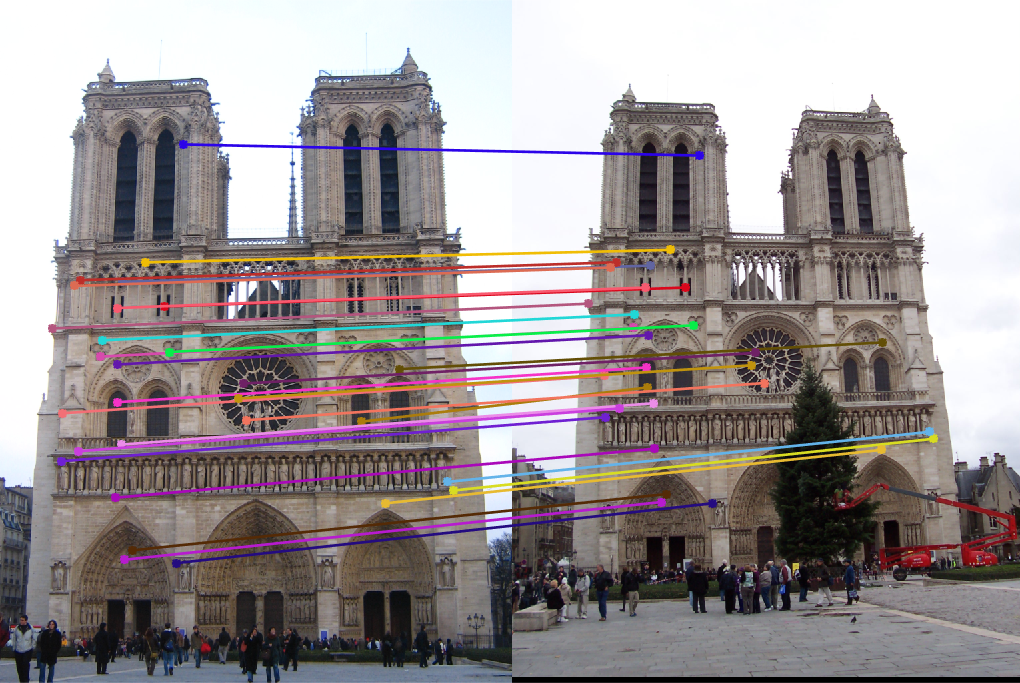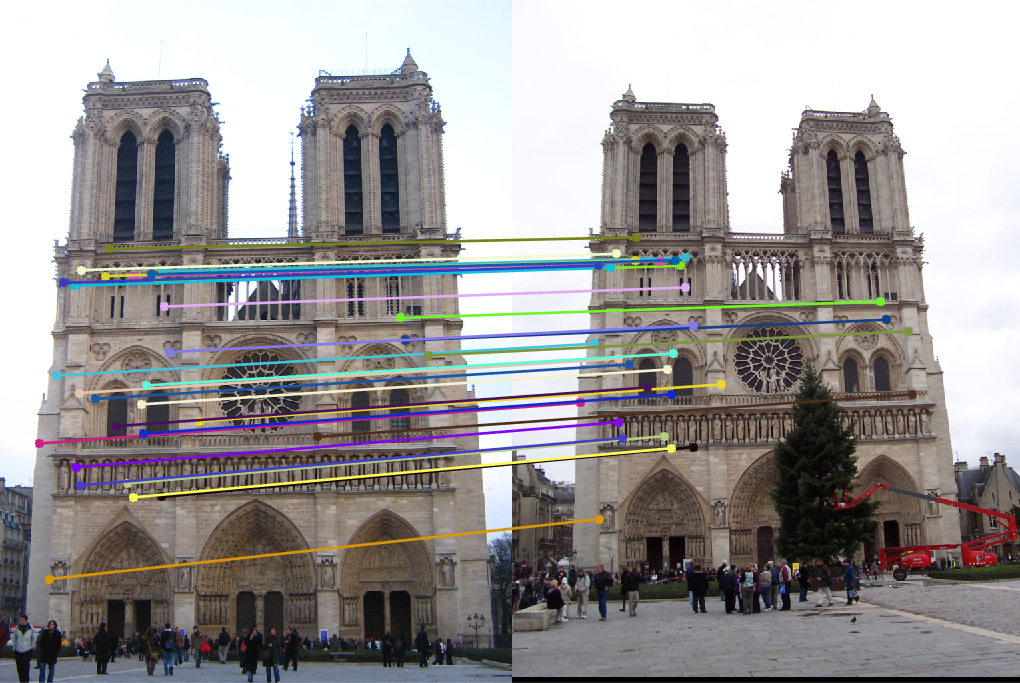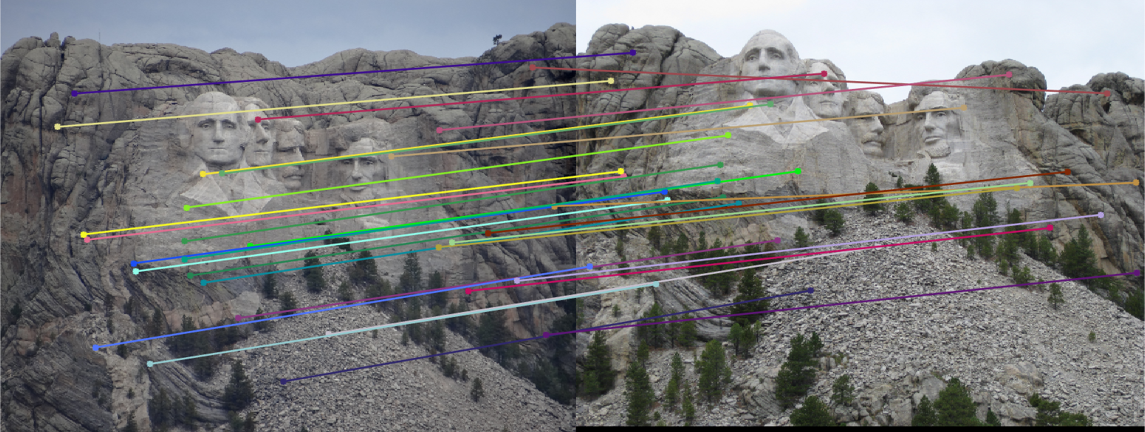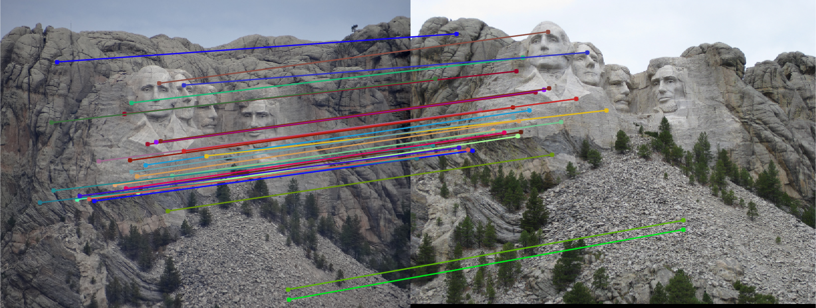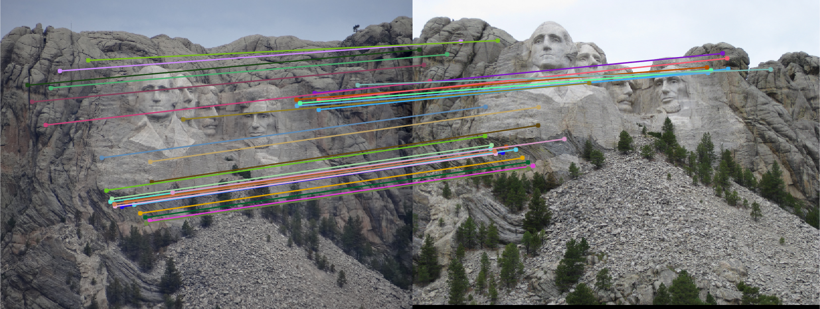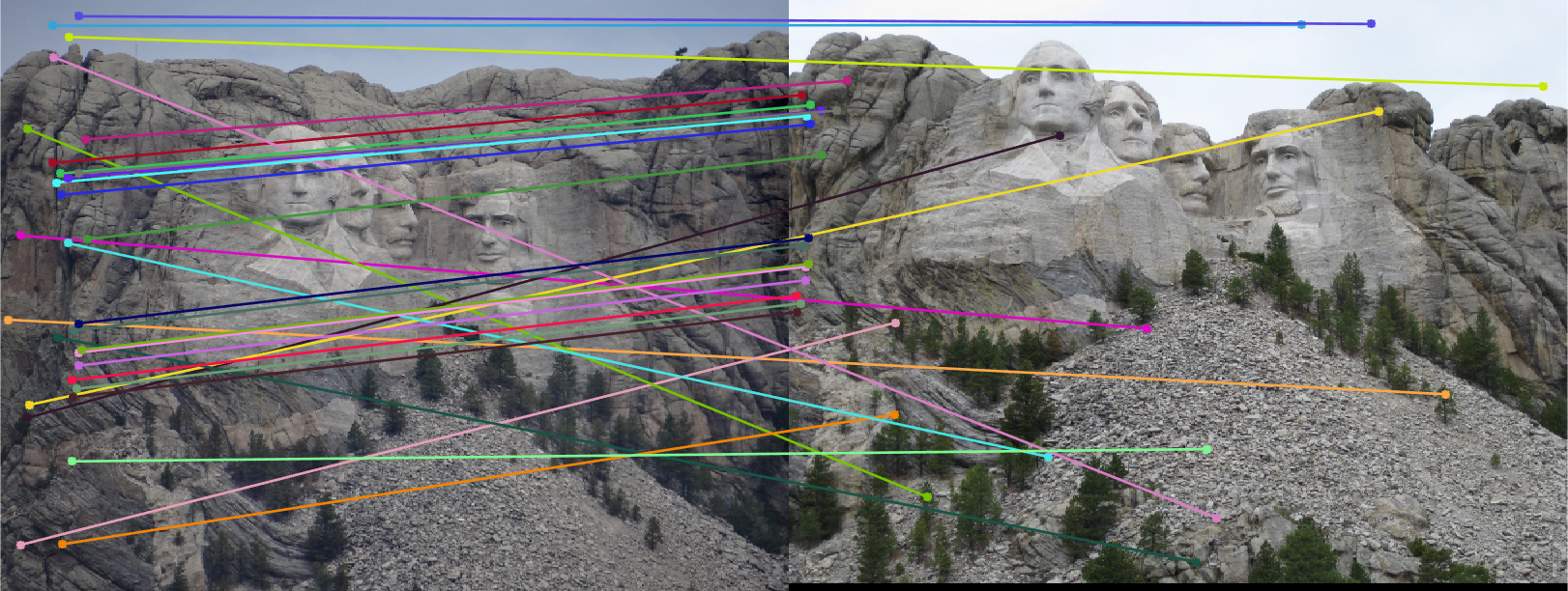 Fig.11: Putative 30 best SIFT matches without RANSAC (Fig.9(right)) and 30 inliers correspondence matches for Mount Rushmore image pair. |