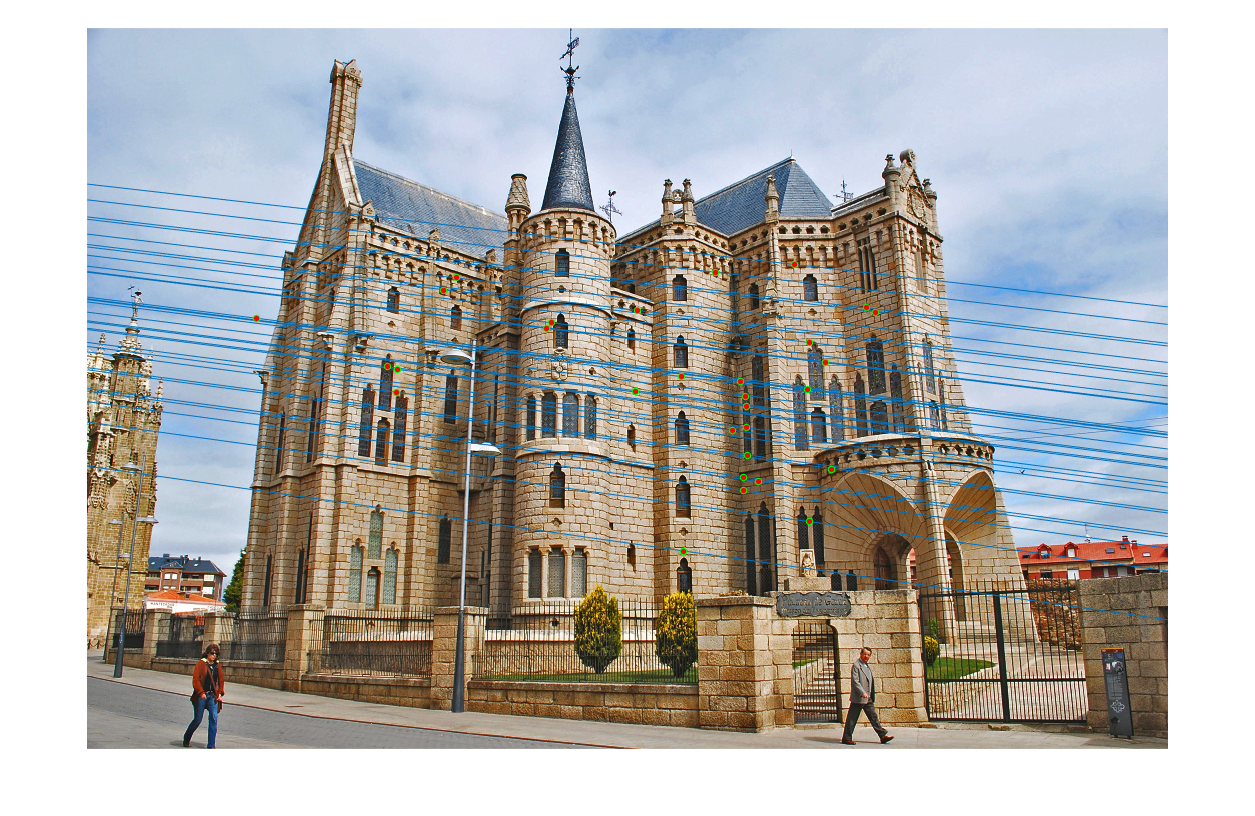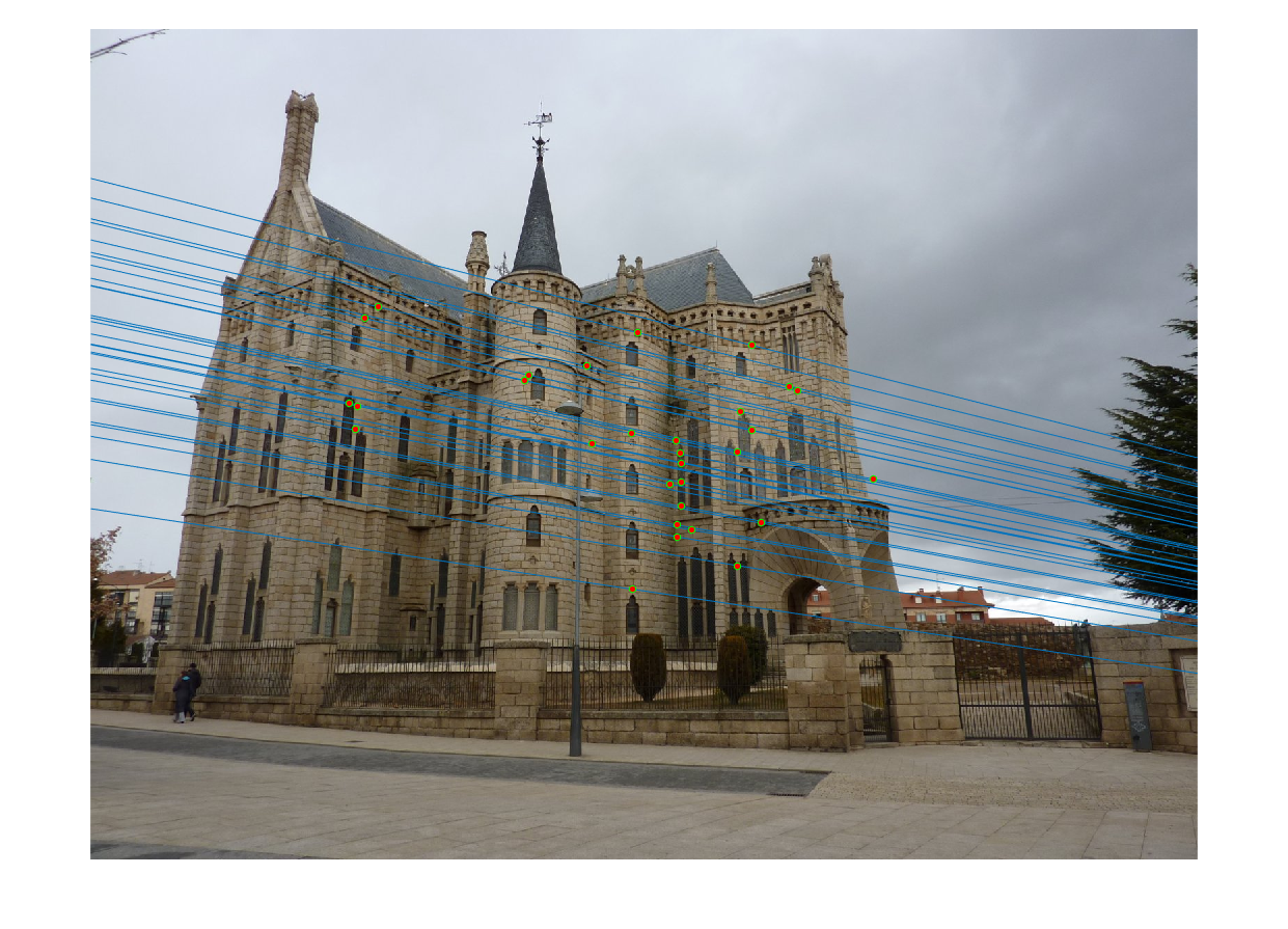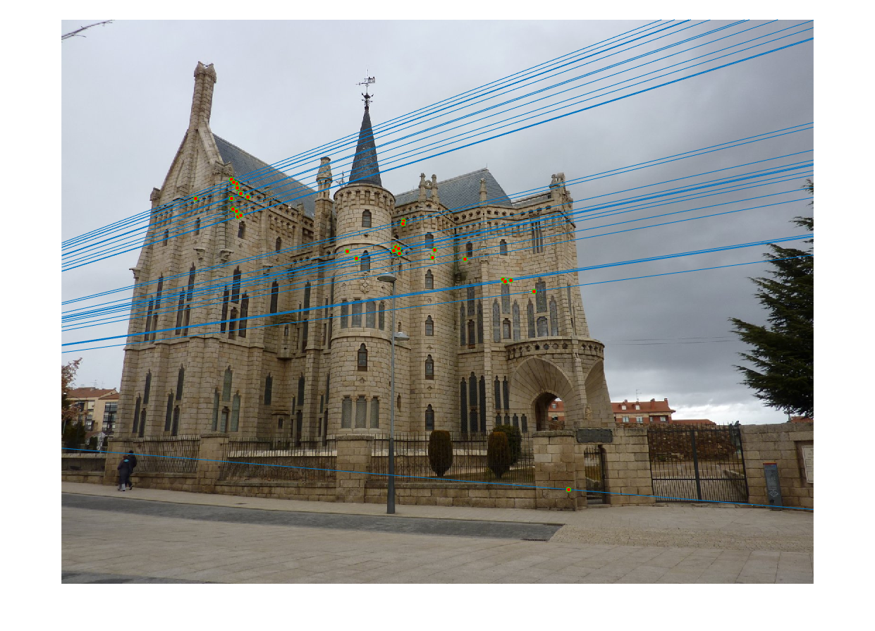 We normalize the coordinates listed in pts2d-pic_a.txt and pts2d-pic_b.txt and plot the epipolar lines as presented in Figure-16 and compare it with Figure-8 along with fundamental matrices.