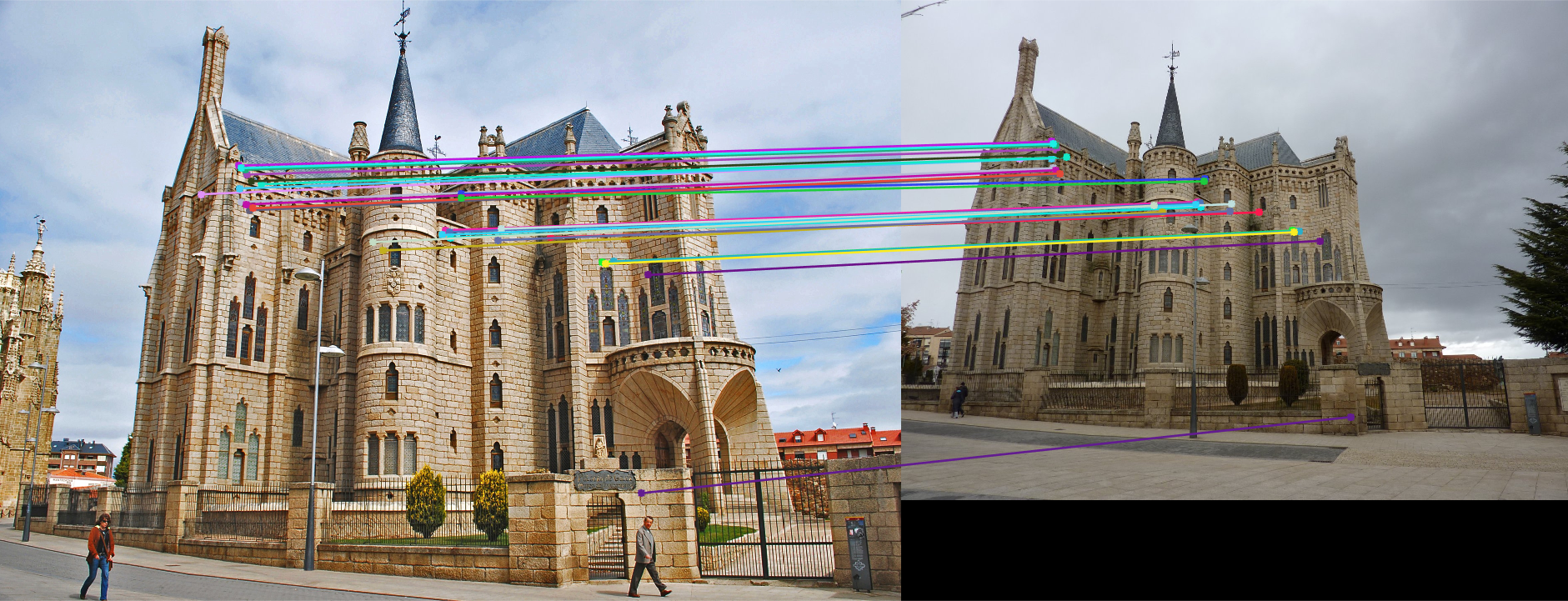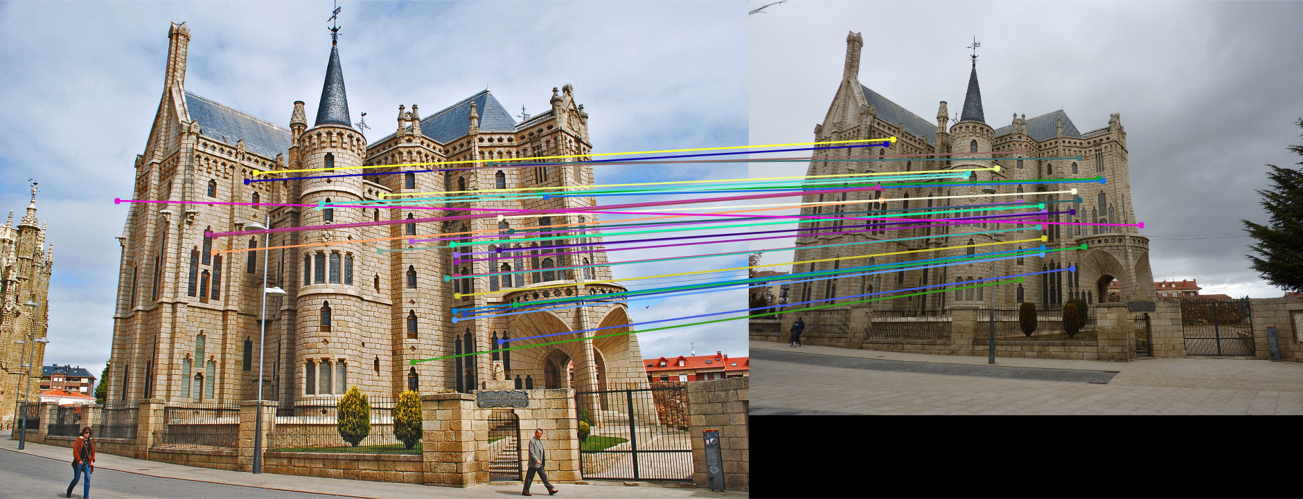 In the following figures, we present several different images with the epipolar lines drawn on them and with the inlier keypoint correspondences shown. Calculated best fundamental matrices and corresponding overall distance errors are also presented for each images. It is worth to note that we have to set e=0.3 to get enough inliers for Figure-15.