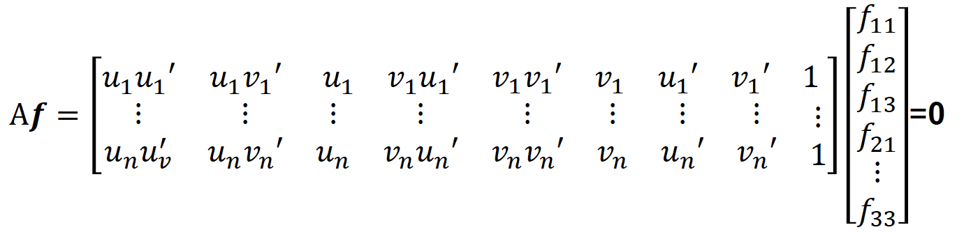 , where s is scale, cu and cv are the mean coordinates in offset O matrix, u and v are coordinates of given key points, and u' and v' are the scaled coordinates. To compute a scale s we estimate the standard deviation after substracting the means from coordinates. And, we calculate scale matrix S for each image. After scaling our coordinates, we apply denormalization to fundamental matrix Fnorm to get original fundamental matrix as: