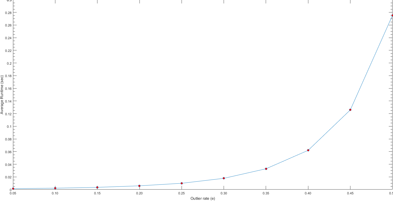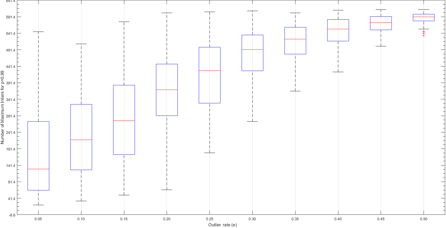In this section, some statistical analysis is made to pick free parameters tuned in Part-III for RANSAC algorithm. First, outlier rate of e is tuned. To do this, we measure maximum number of inliers for each value of e. We iterate e by incrementing it 0.05 each time from 0.05 to 0.5. Moreover, we take 100 averages for each iteration of e to normalize found maximum inliers count. At the same time, we measure the average runtime for each iteration of e to find the trade-off between calculation time of the fundamental matrices and resulted inliers. As we can see from the following boxplot of found maximum number of inliers and average running time for each value of outlier rate e, it is better to choose e=0.1 at minimum to get enough inliers (at least 30 for this case) in all iterations of RANSAC algorithm. On the other hand, increasing the e values is not a costly operation until the value of 0.25. After this point, the running time start increasing more obviously.