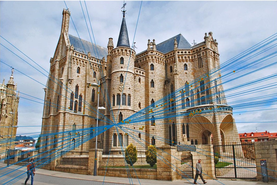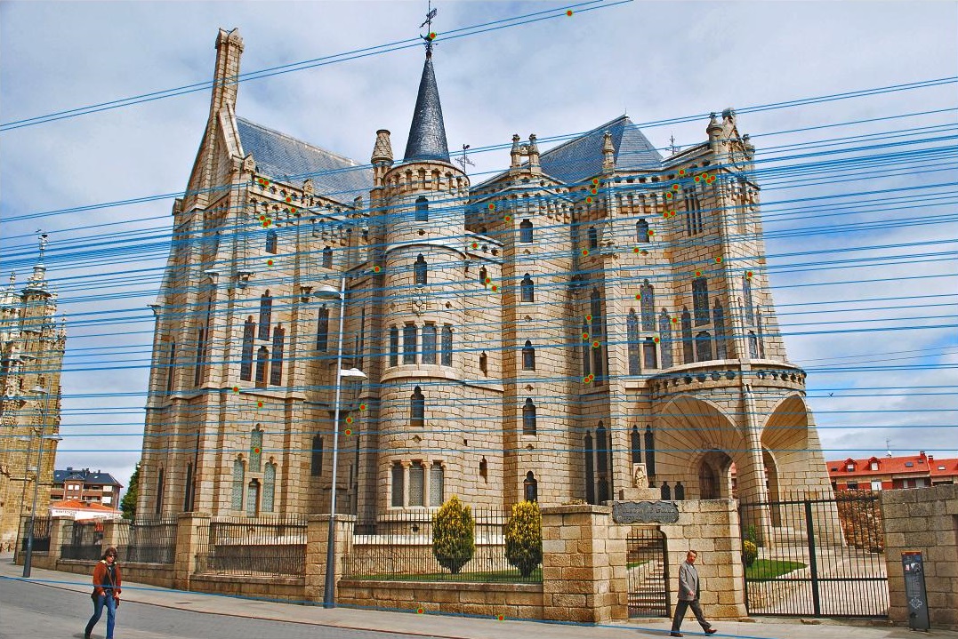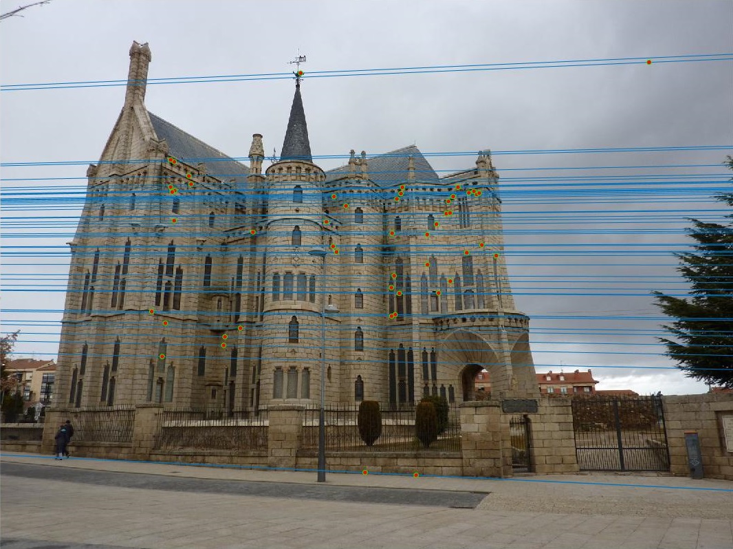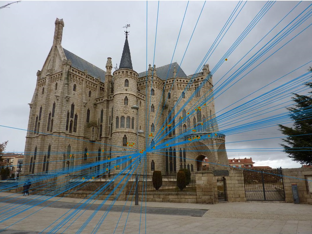 Episcopal Gaudi without normalization in the calculation of the fundamental matrix proved to be quite messy, with a noticeably large amount of points still being outliers. This filtering is definitely more accurate than what was done in the last project without scene geometry, but could still use improvement.