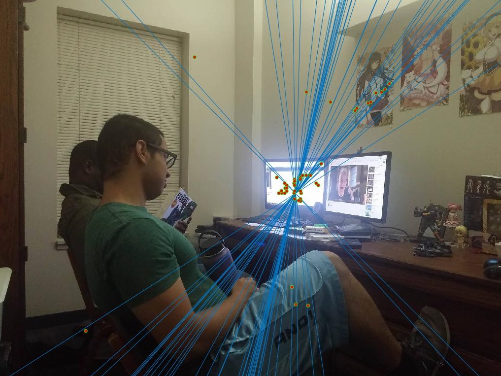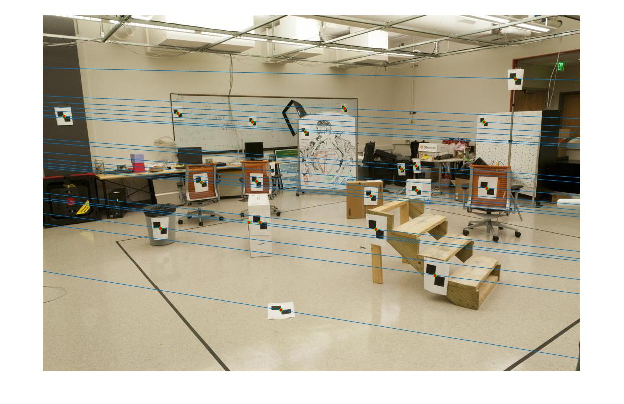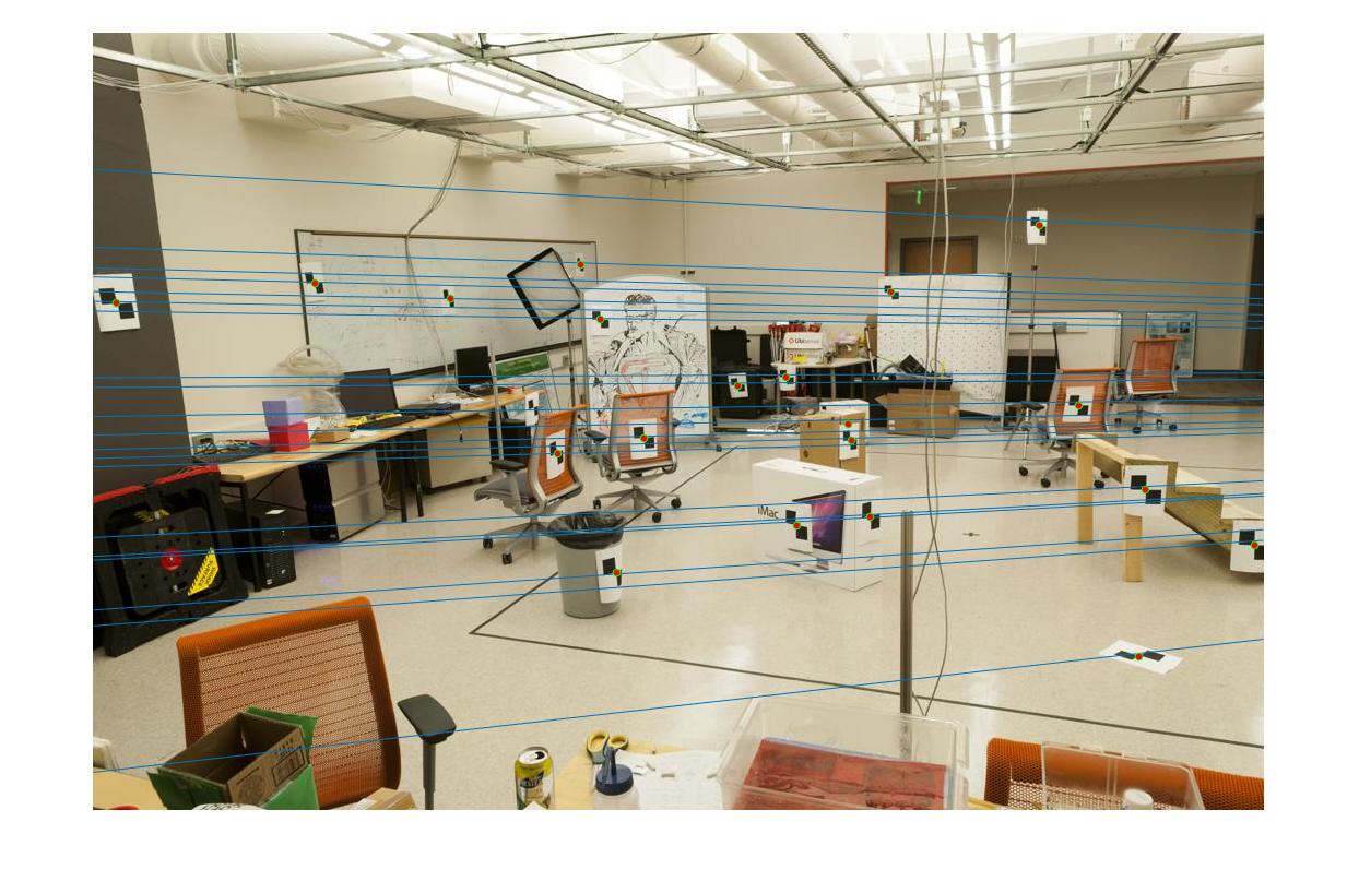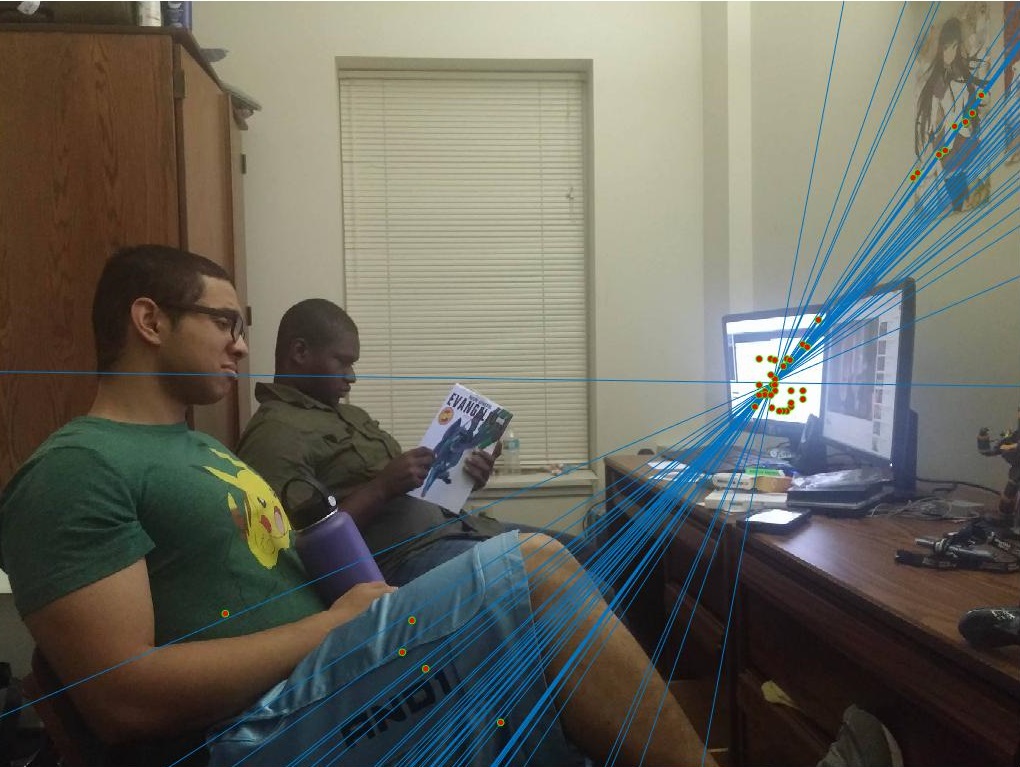 When this part was tested with the two experiment room test images, the resulting epipolar lines calculated from the fundamental matrix did not directly cross through all of the points - which I assume may be due to the large difference and lack of normalization of the points, or because the change to make F rank 2 resulted in some variation and shift in the lines, as the lines did cross through all of the points through the center before rank reduction. However, this problem was fixed by implementing normalization (which was extra credit for this project). The below image shows the results for part 2 (epipolar line estimation for the experiment room/testing image) before normalization.