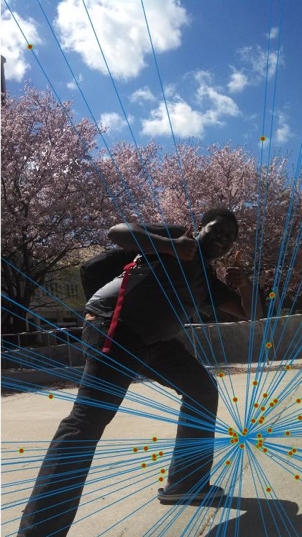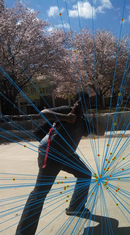 The second part of the project was to calculate the fundamental matrix given a set of matched points between two images. The fundamental matrix is used to estimate the mapping of points in one images to lines (that correspond to the depth of the original image) in another image. These lines are called epipolar lines, and can ultimately be used to filter out incorrect matches (as matches originally calculated that do not fall on the calculated epipolar lines are likely to be incorrect).
