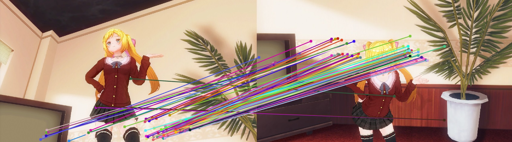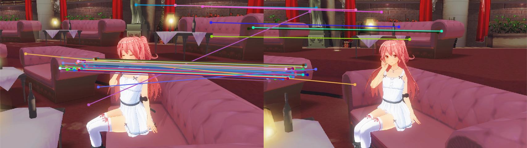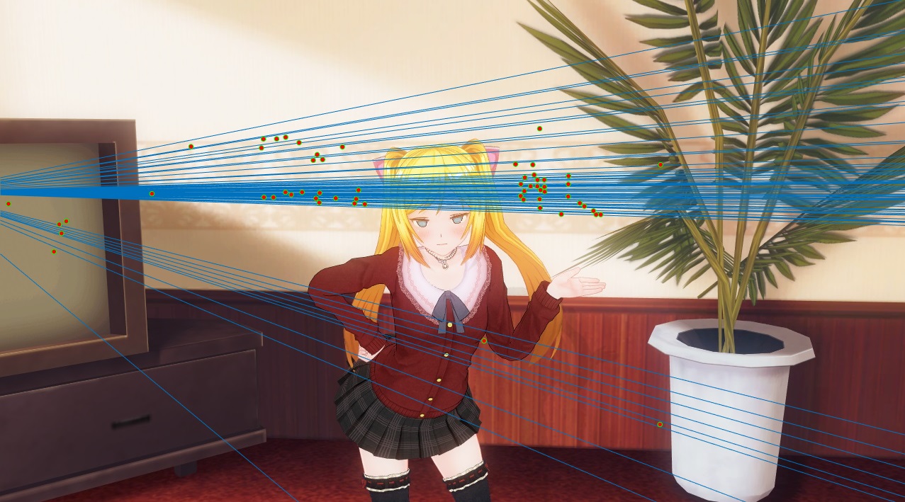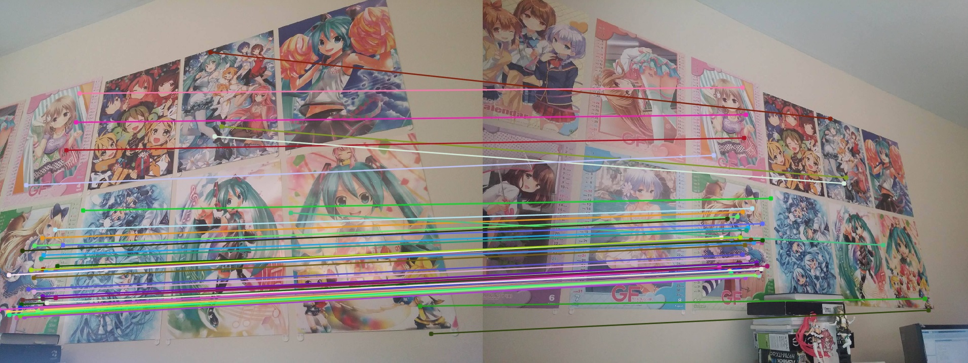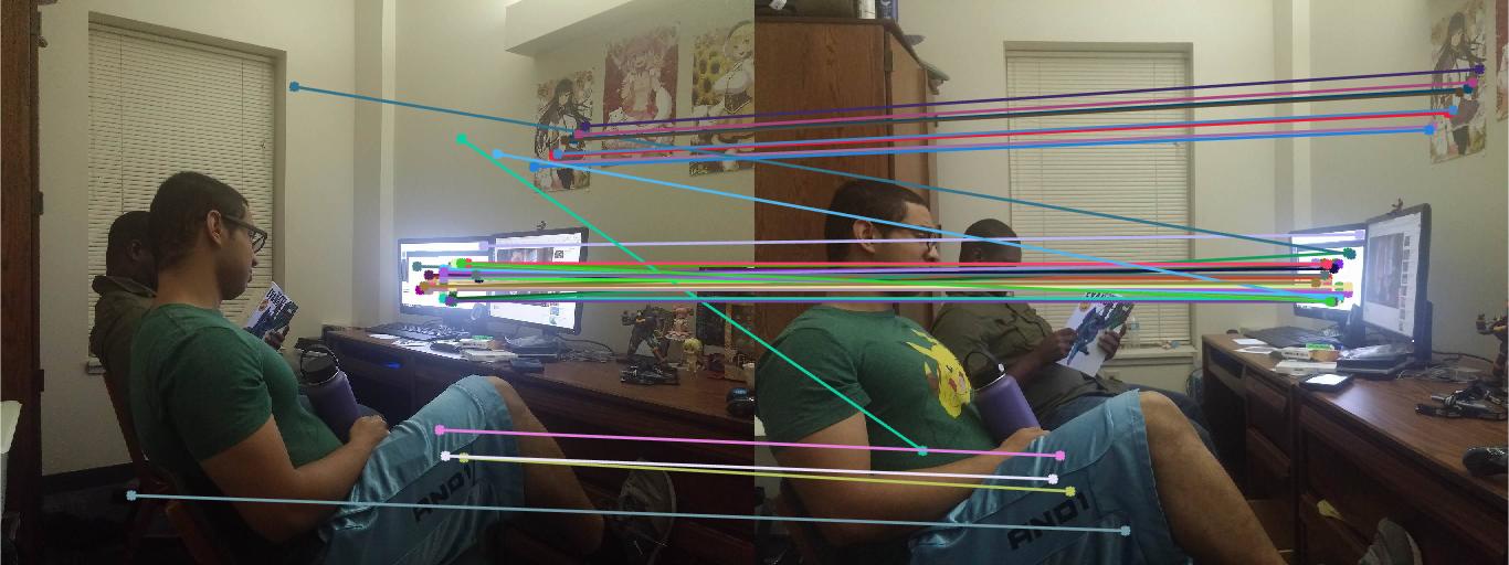 This image pair did fairly well, with some outliers pointing to the wrong couch. Most of the points were clustered from one couch arm, but a few points were also shown from the back that also matched up well. It seems like this algorithm, for non real images, tends to cluster on small yet intricate patterns that are not as noticeable to the human eye for feature matching.