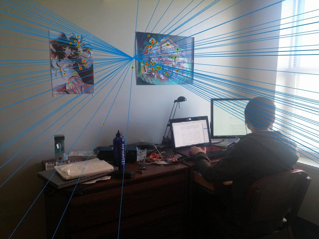 This pair of roommates did not do as well as the previous examples, with some points blatantly wrong and some others, even though grouped in the right general direction, still somewhat off. Most of the points seemed to be clustered around the monitor, even though it appeared to be mostly one color - maybe there's distinct noise over there? The poster matches do seem pretty accurate, however.