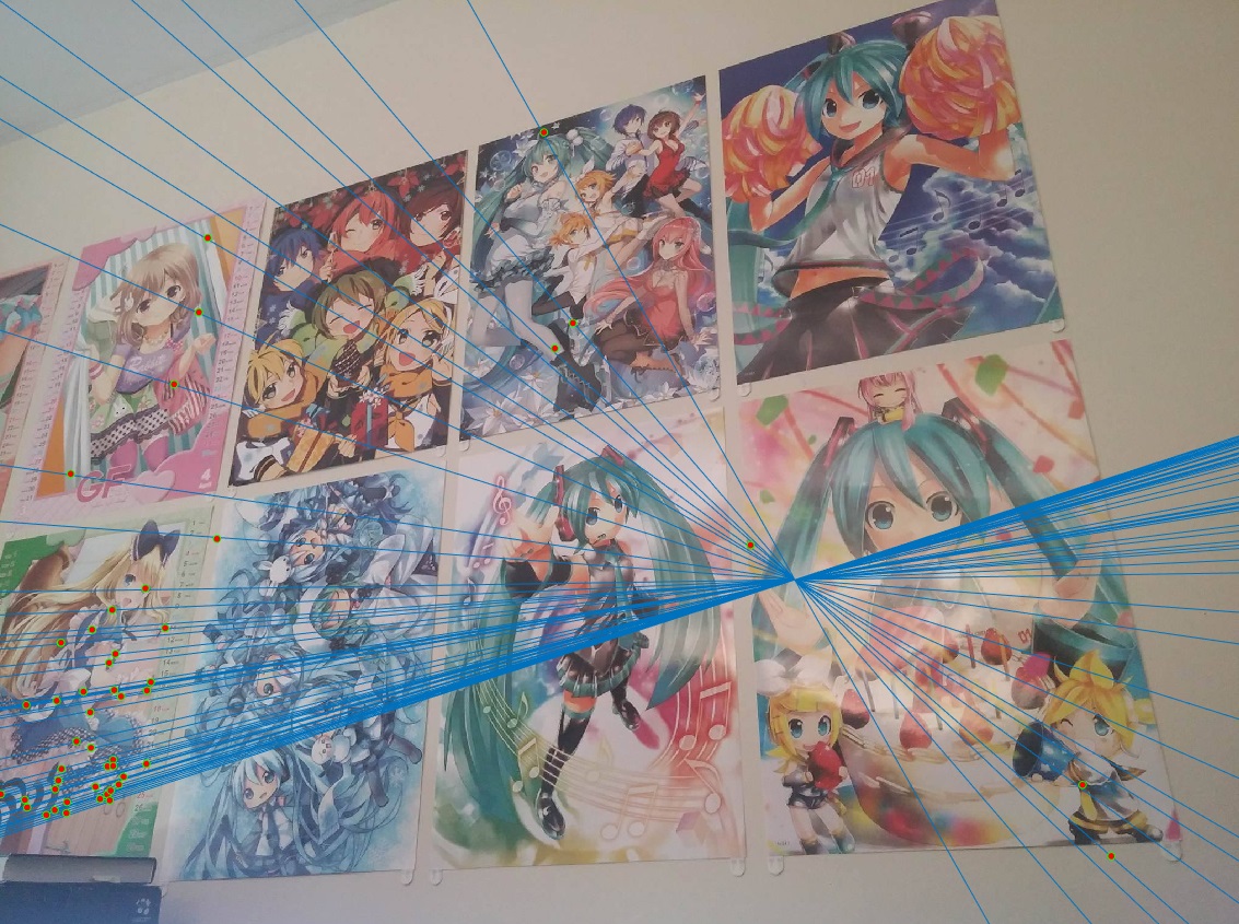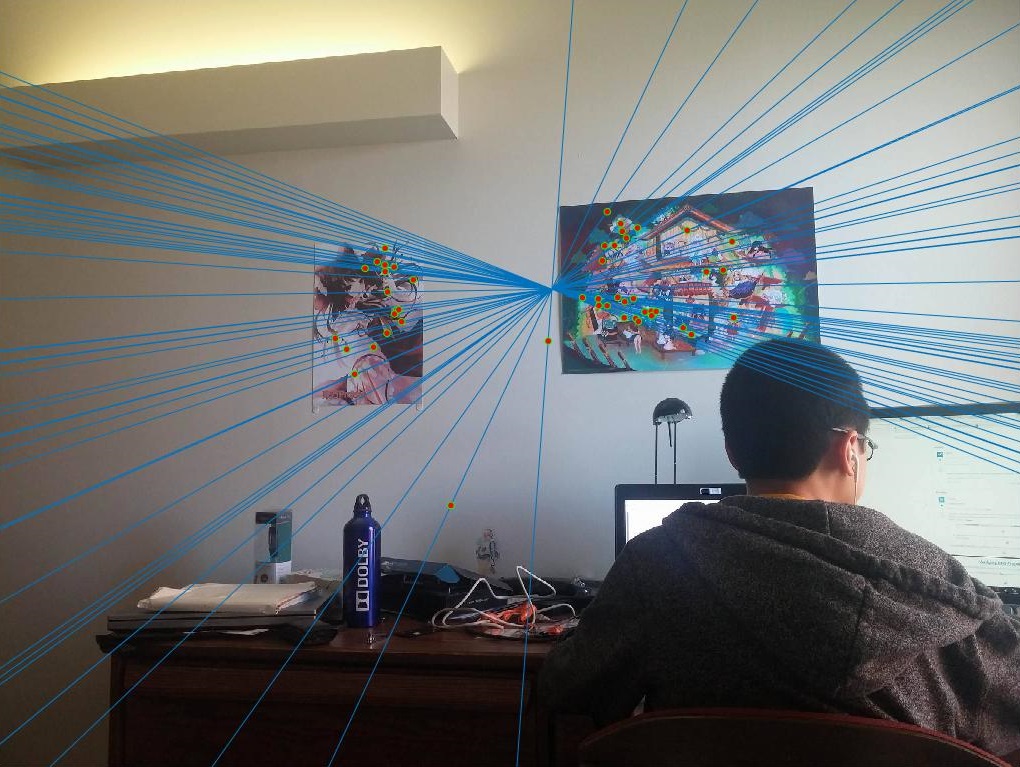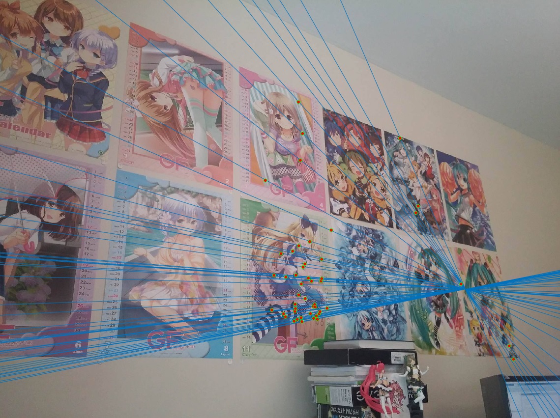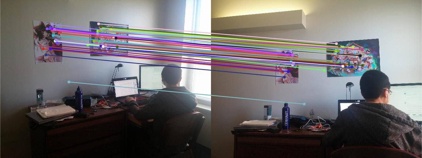This image pair did not work at all in the last project, but now seems to work somewhat better. Most of the points comes from the strip of patterned design on the wall. After normalization of the fundamental matrix, however, this image pair did a lot poorly even after many tries and a higher number of RANSAC iterations. This may be due to the fact that these images are not from the real world, as the other image pairs have shown improvements.