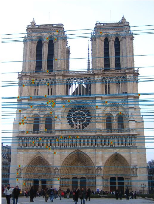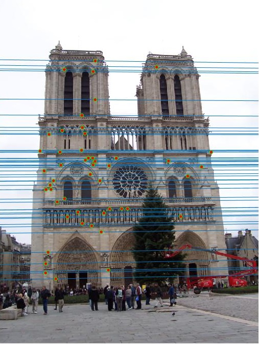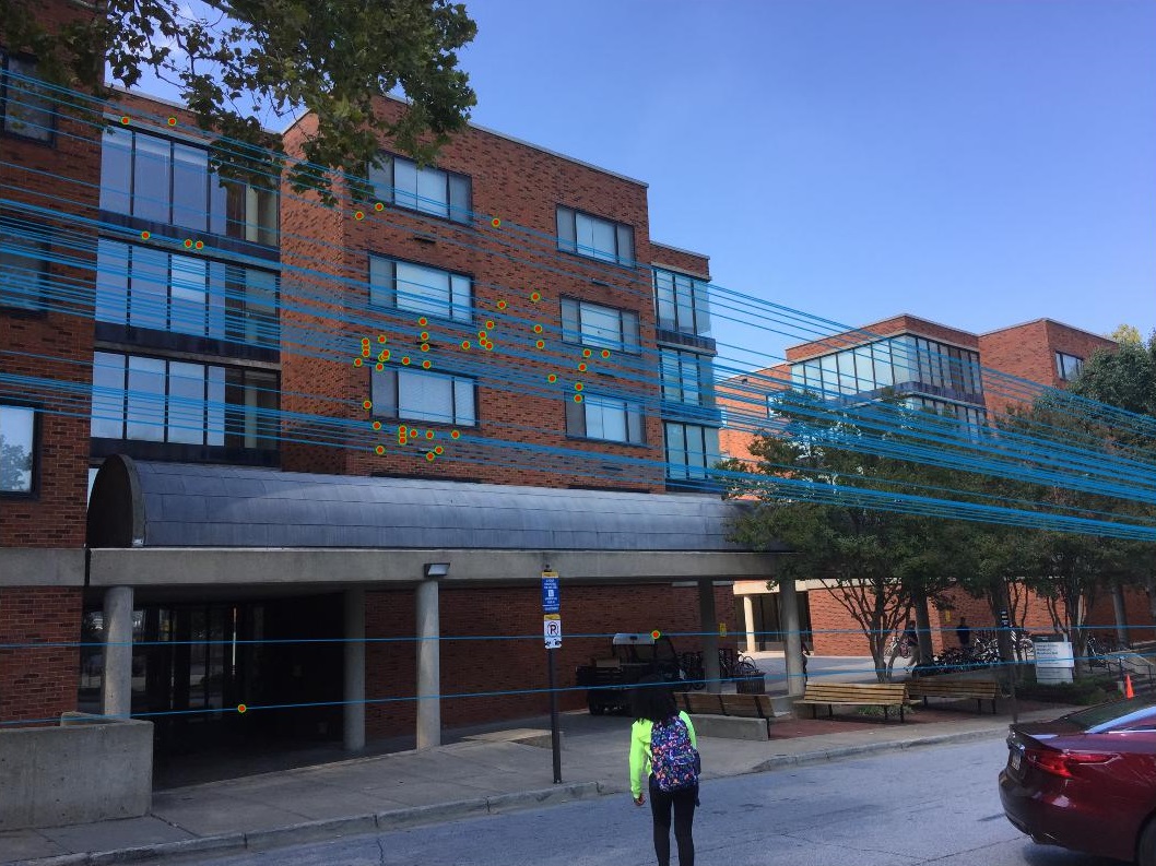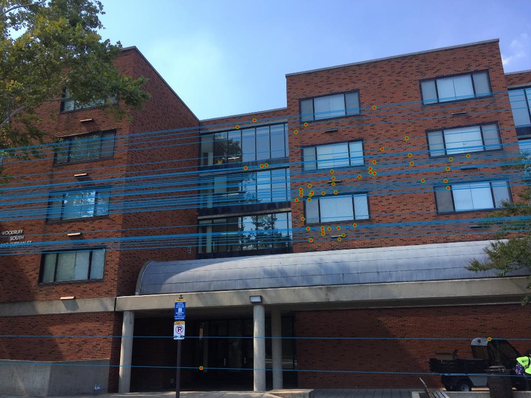 Woodruff shows pretty accurate matches overall, with the epipolar lines also corresponding to the geometry of the scene pretty well (notice how they go in alignment with the building).