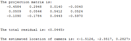 Now, from that projection matrix, the camera center in world coordinates was estimated. The projection matrix M can be split into a 3x3 matrix called Q and the final 3x1 vector that is called m4 (since it is the fourth column of the matrix). The camera center can then be calculated by doing the dot product between negative Q inverse and m4.