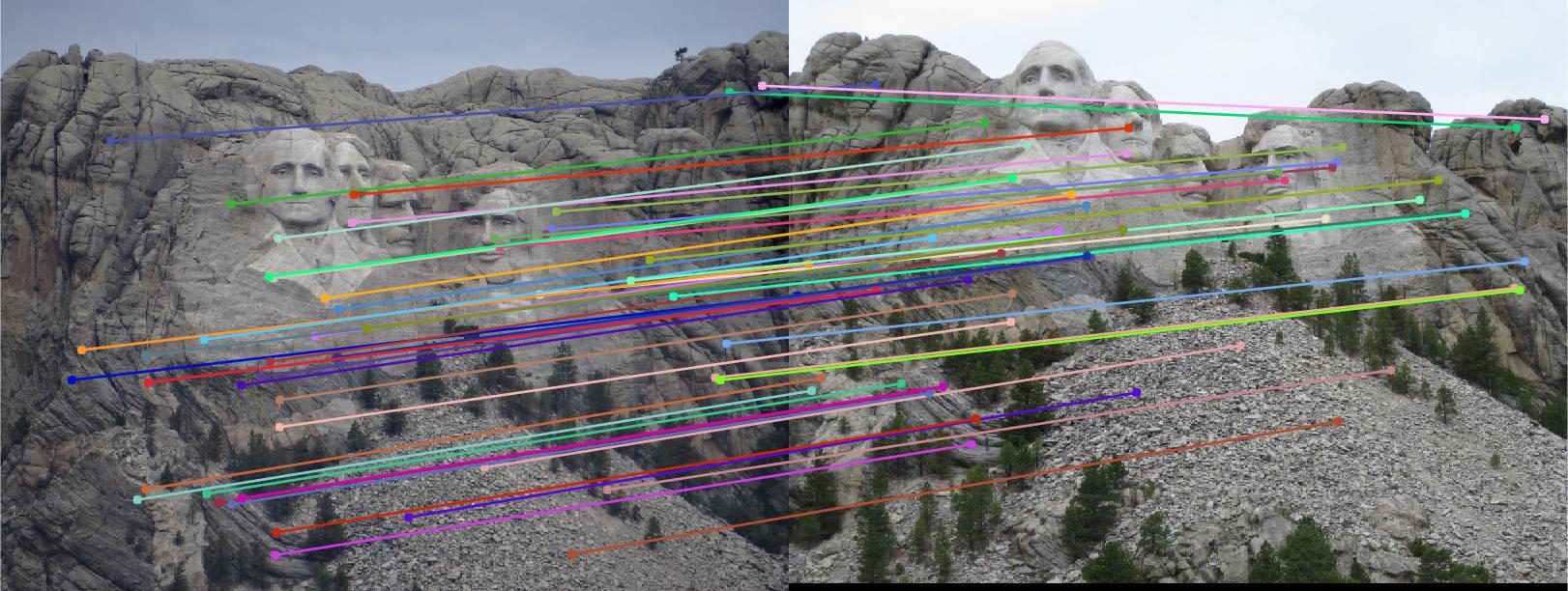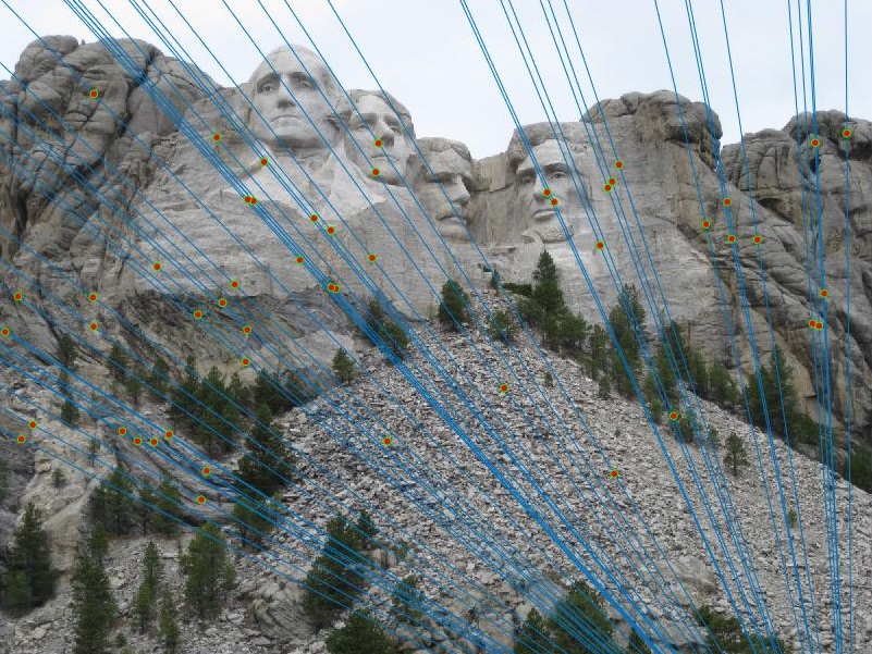 Of the top 50 matches, it appears that most of the matches seem to be accurate. VLFeat's original matches for Mount Rushmore were also very accurate, as with a threshold of 0.005 most were deemed as inliers (roughly 600 out of the 1000 were deemed as inliers with the current threshold). Even with a relatively high threshold for this image, the matches generated seem to be very accurate when ordered by lowest distance.