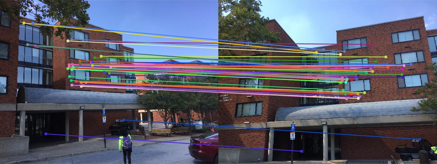 For this project, the goal was to use camera callibration and scene geometry to assist in the process of matching up points from one image to another image. This relies heavily on the calculation and estimation of the fundamental matrix, which is what relates points from one image to another using epipolar lines (how the point would differ on the other image if the depth changed in the first image). By estimating the camera projection matrix and fundamental matrix through the 8-point algorithm and RANSAC, we can filter out incorrect matches that do not correspond with the calculated and estimated fundamental matrix, thereby increasing the overall accuracy and confidence of our matches. The original matching of features on both images was done in the previous project, so in this project, VLFeat was used to generate an initial list of potential feature matches, which was then filtered by using the fundamental matrix and epipolar lines.