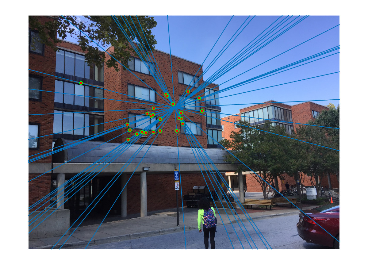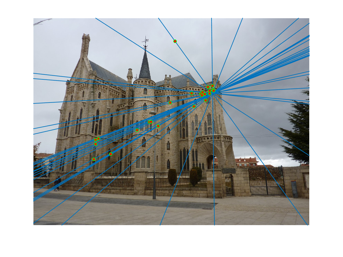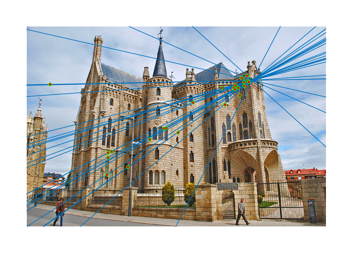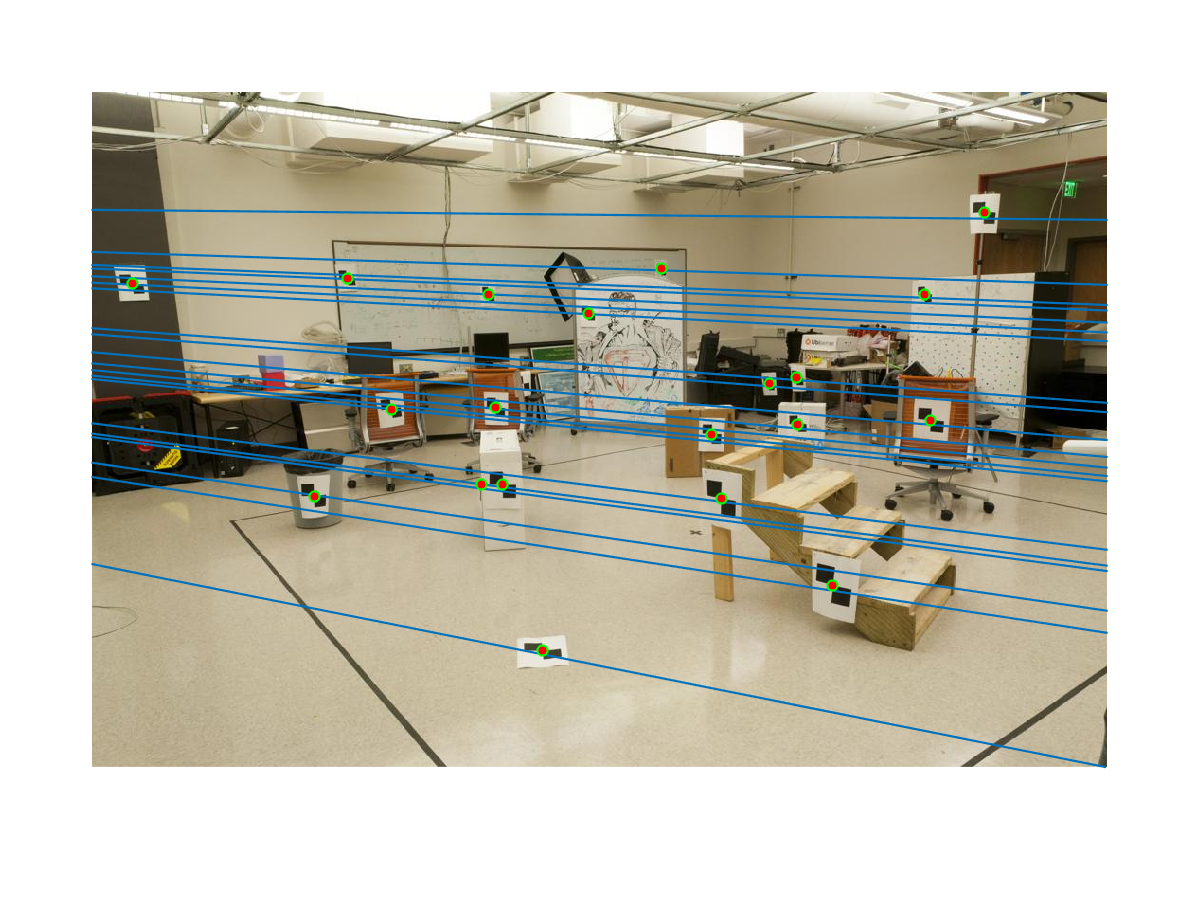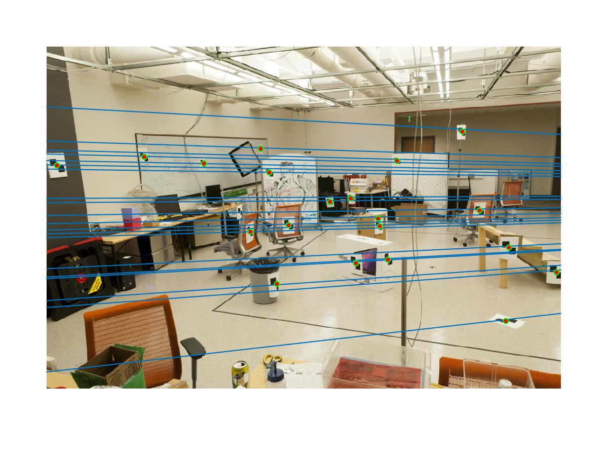 We can obtain this visualization if we draw epipolar lines and the points on the test image pair: