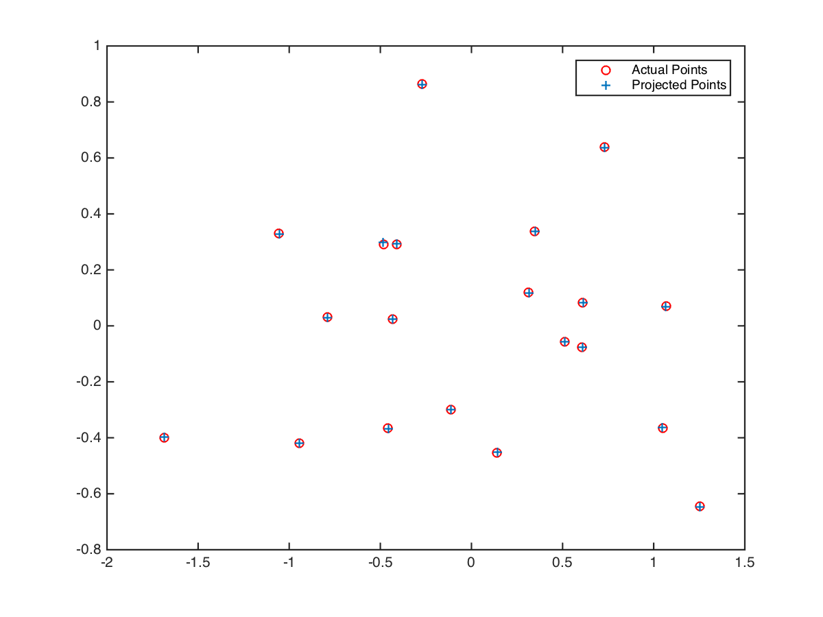 2D visualization of image 2D points and projected 3D points into 2D space gives aligned result: