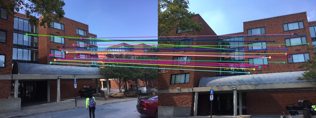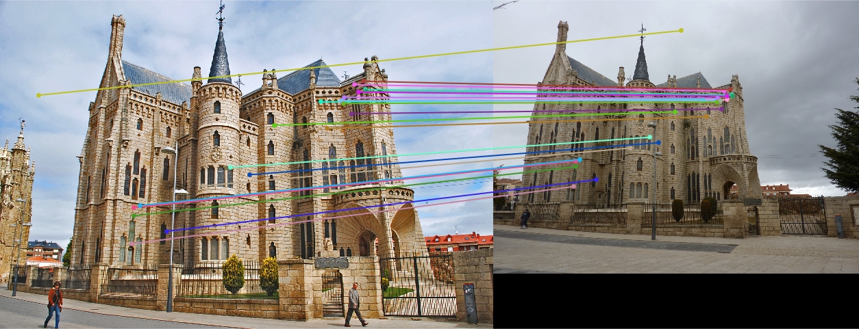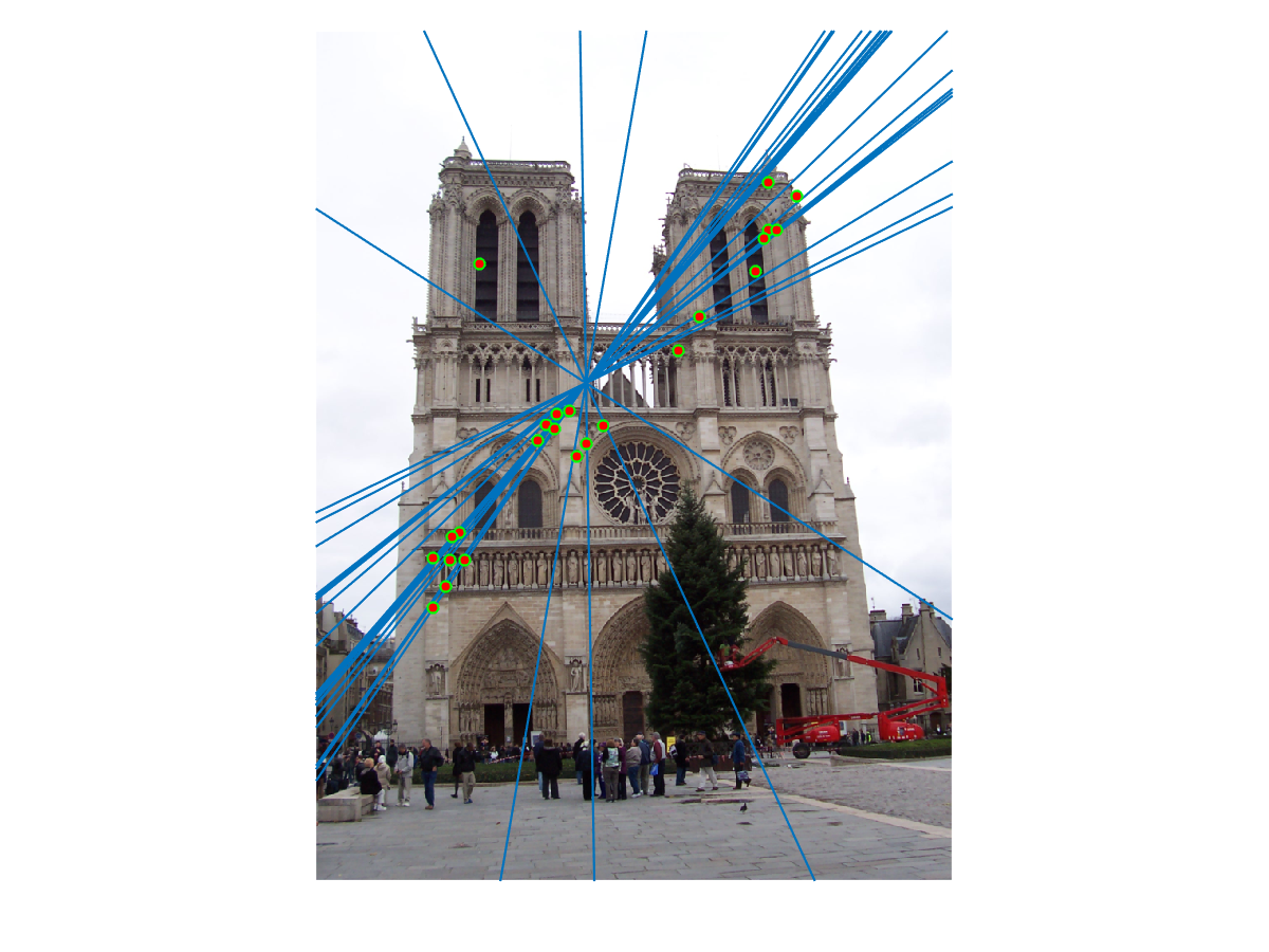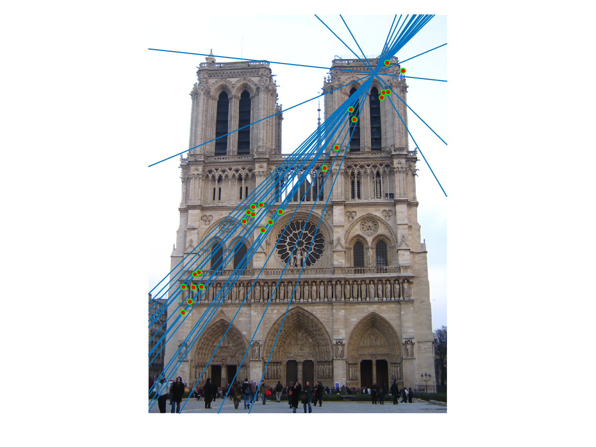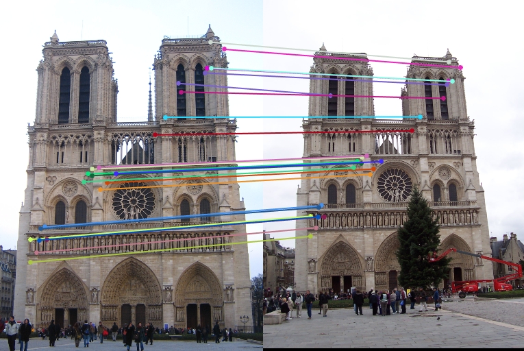 This algorithm works fine with other image pairs. For Notre Dame pair, we use similar visualization to get these results: