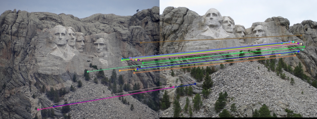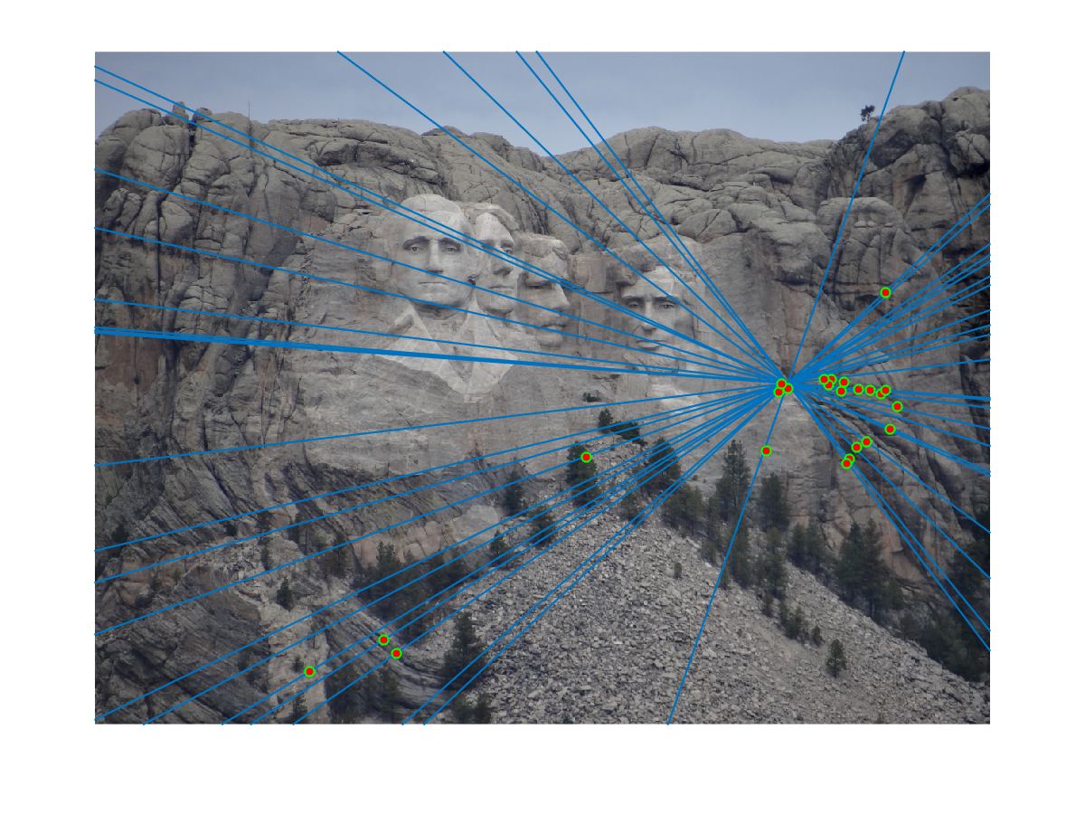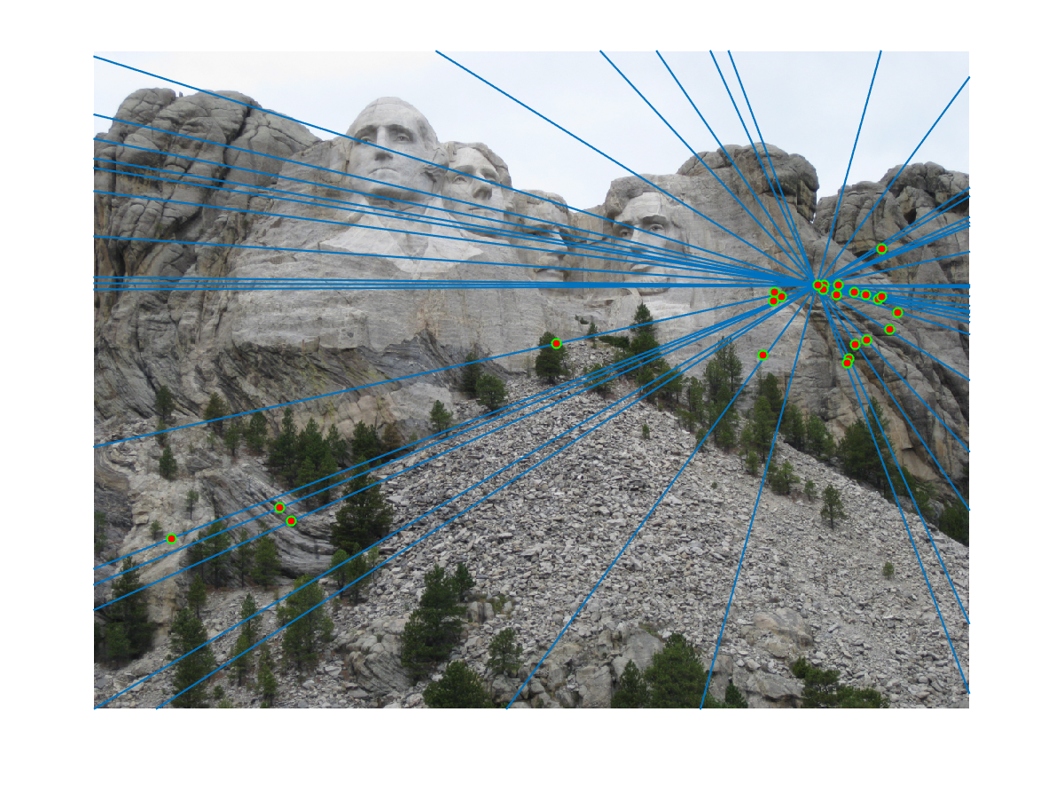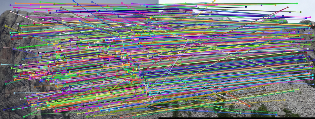 Finally we randomly select 30 inlier pairs to make visualization like this. We did experiments on image pairs of Mount Rushmore, Notre Dame, Gaudi and Woodruff hall. Since I set model threshold to be very low, we found RANSAC did a good job filter out outliers and gives almost only correct matchings. For example, Mount Rushmore has a noisy SIFT matching result (upper), and RANSAC successfully selected true inliers (below):