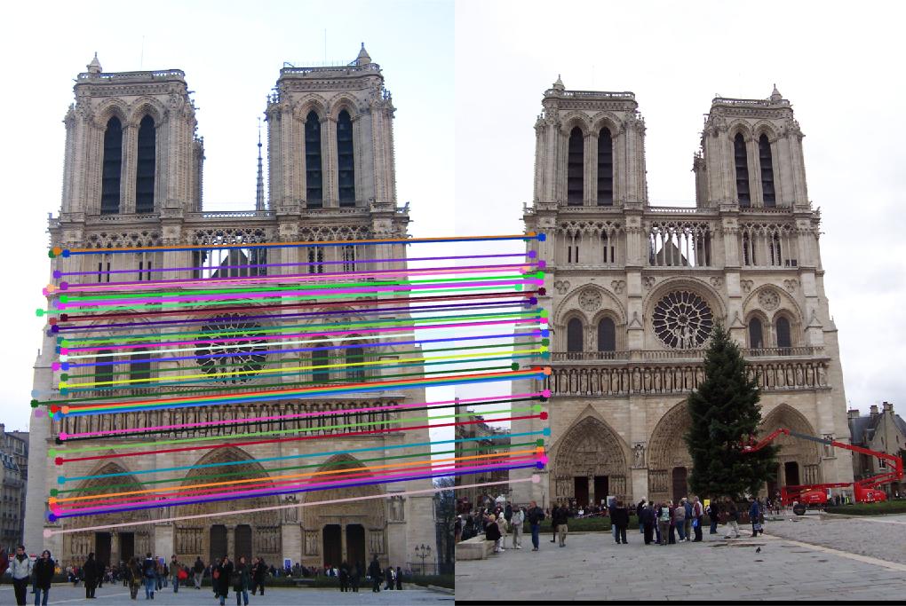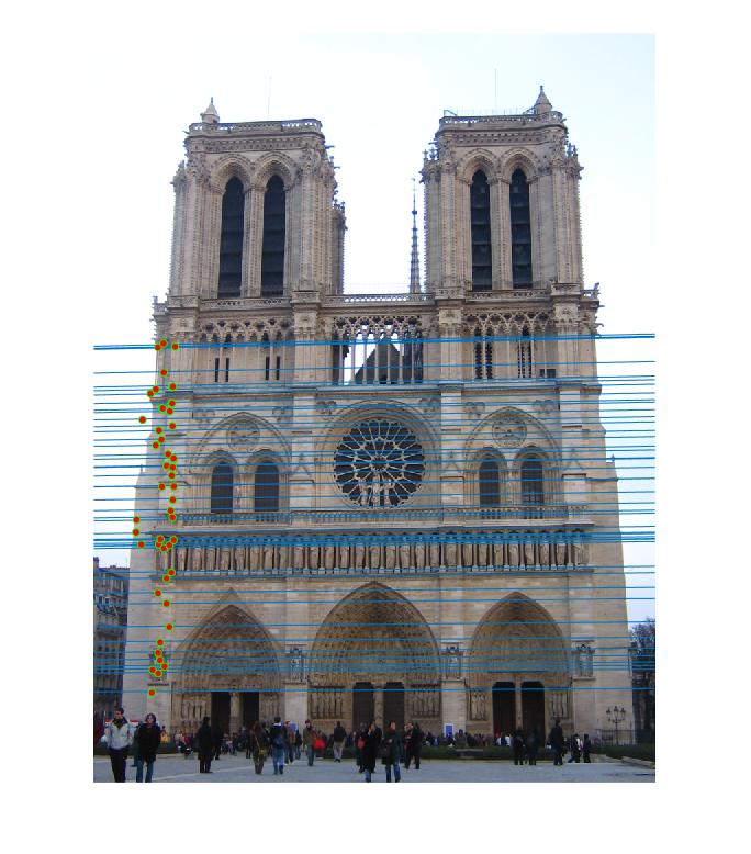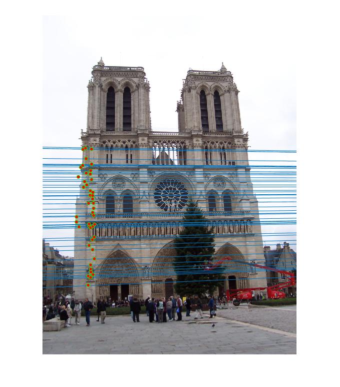(b) Fig. 4 (a) Refinement of feature point matches using RANSAC for Notre Dame (Threshold: 0.05, Iteration Number: 10000); (b) Epipolar lines with feature points in the left image for Notre Dame; (c) Epipolar lines with feature points in the right image for Notre Dame. |