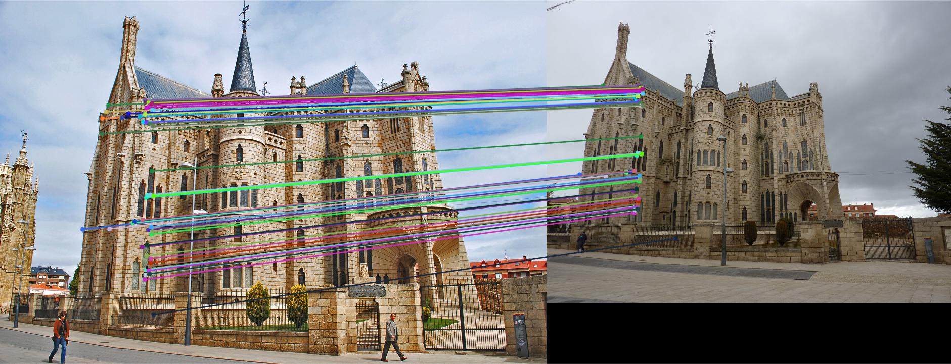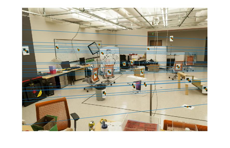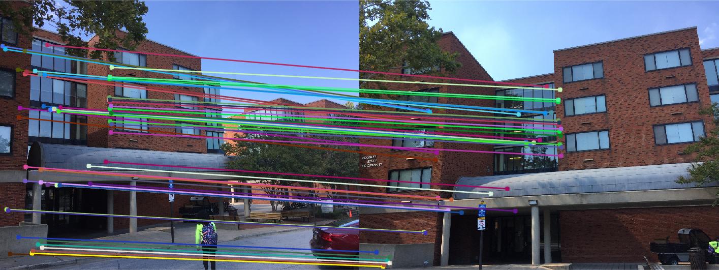 In part 3, several different images with the epipolar lines drawn on them and with the inlier keypoint correspondences are shown from Fig. 3 to Fig. 6. The coordinate normalization is performed in calculating the fundamental matrix during each RANSAC iteration. Note that much more iterations and a lower threshold are used in Figs. 5 and 6, because these two figures have worse feature matches computed from SIFT that Figs. 3 and 4.