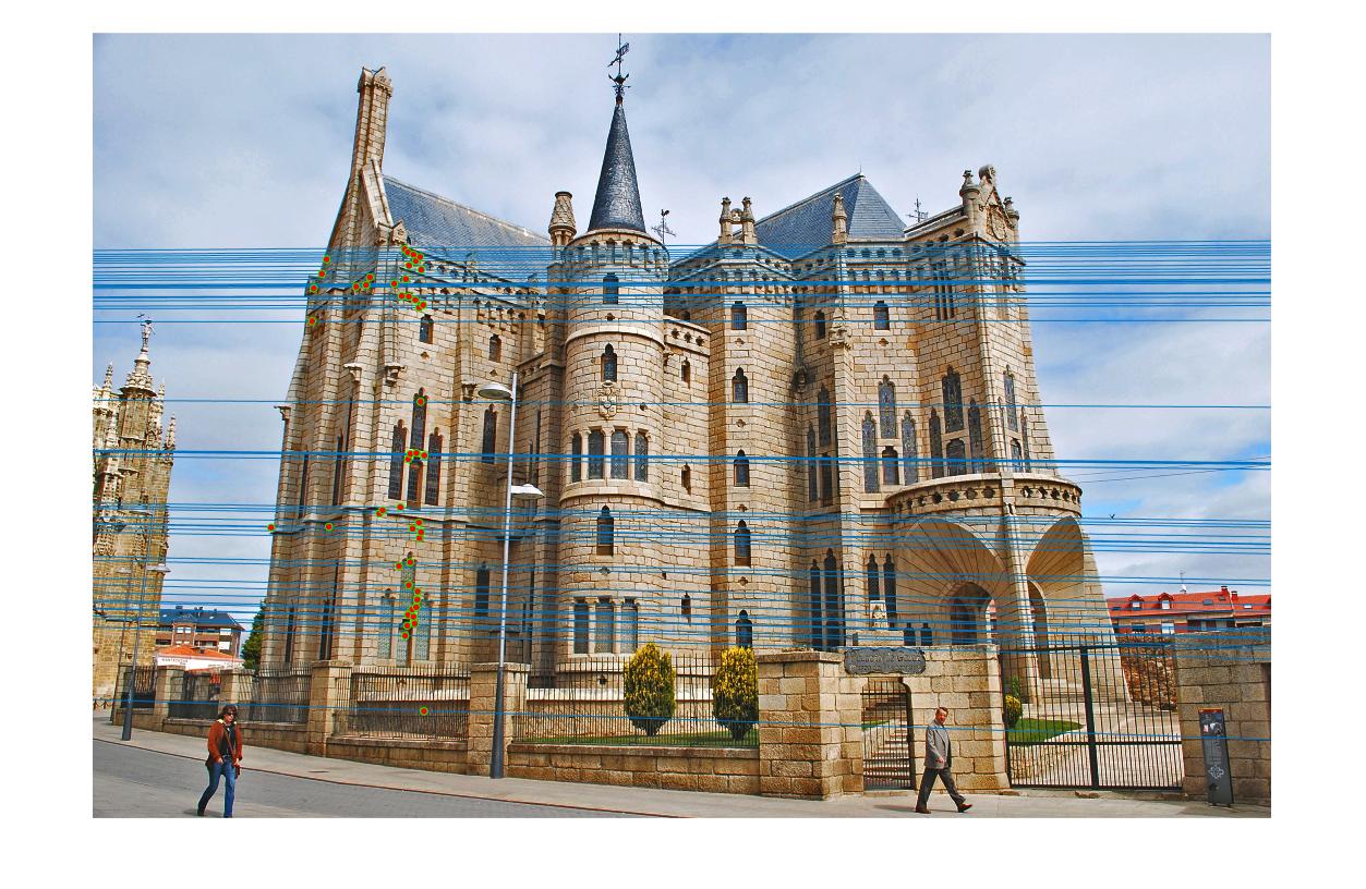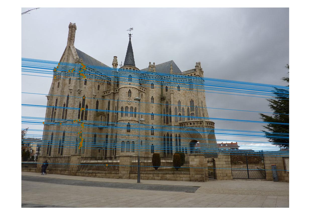 (b) Fig. 5 (a) Refinement of feature point matches using RANSAC for Episcopal Gaudi (Threshold: 0.005, Iteration Number: 100000); (b) Epipolar lines with feature points in the left image for Episcopal Gaudi; (c) Epipolar lines with feature points in the right image for Episcopal Gaudi. |