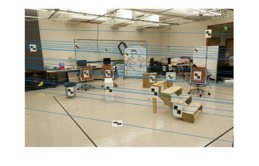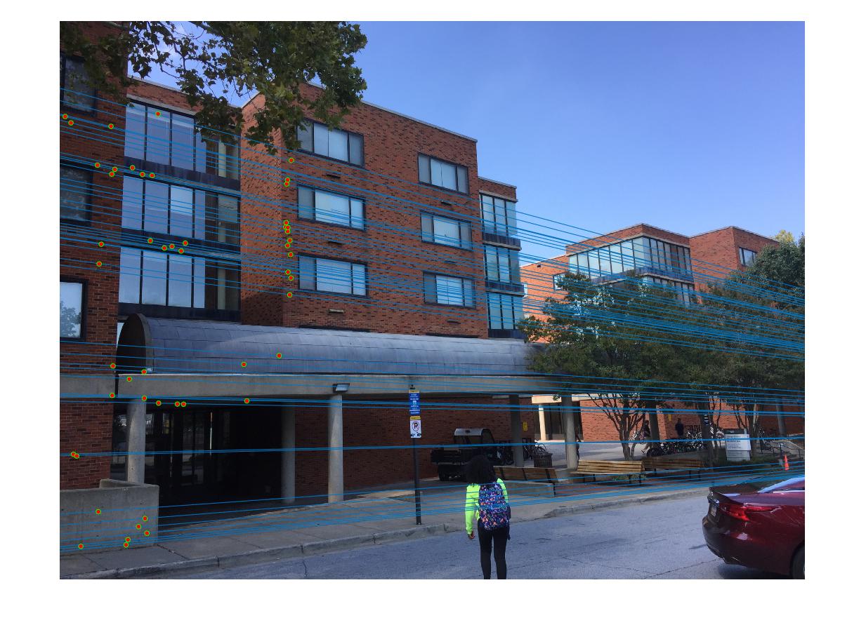 (b) Fig. 6 (a) Refinement of feature point matches using RANSAC for Woodruff Dorm (Threshold: 0.005, Iteration Number: 100000); (b) Epipolar lines with feature points in the left image for Woodruff Dorm; (c) Epipolar lines with feature points in the right image for Woodruff Dorm. |