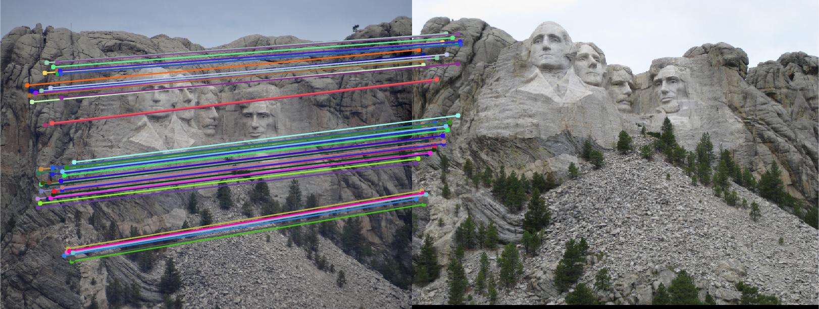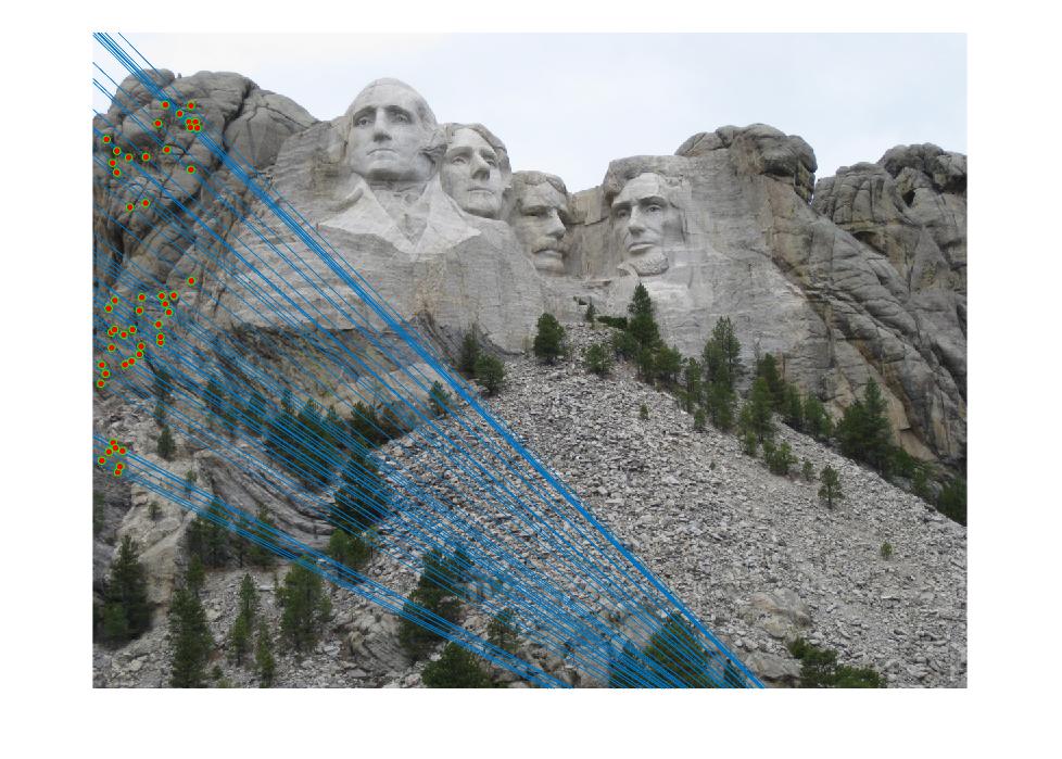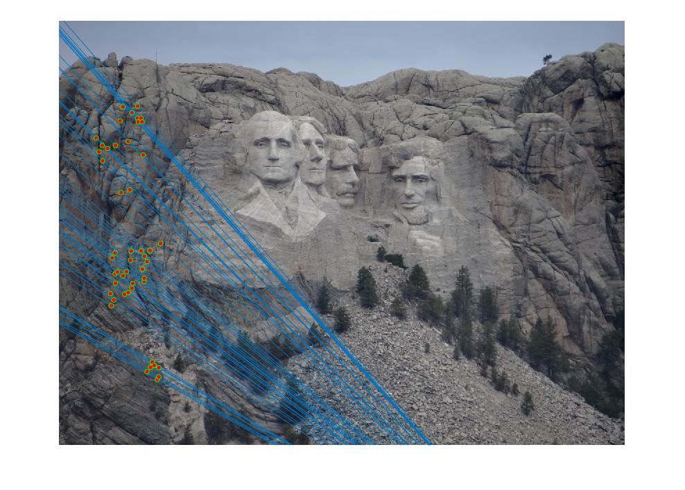 (b) Fig. 3 (a) Refinement of feature point matches using RANSAC for Mount Rushmore (Threshold: 0.05, Iteration Number: 10000); (b) Epipolar lines with feature points in the left image for Mount Rushmore; (c) Epipolar lines with feature points in the right image for Mount Rushmore. |