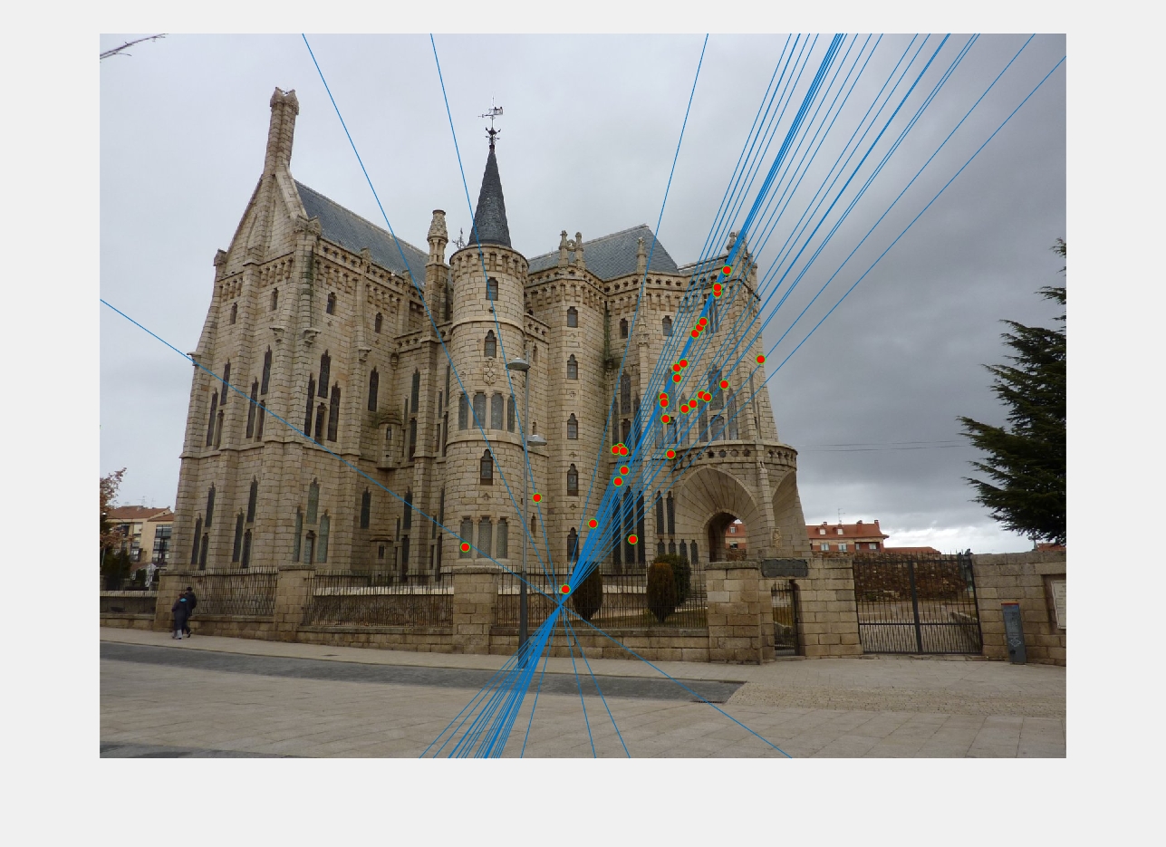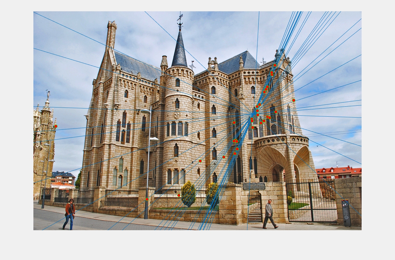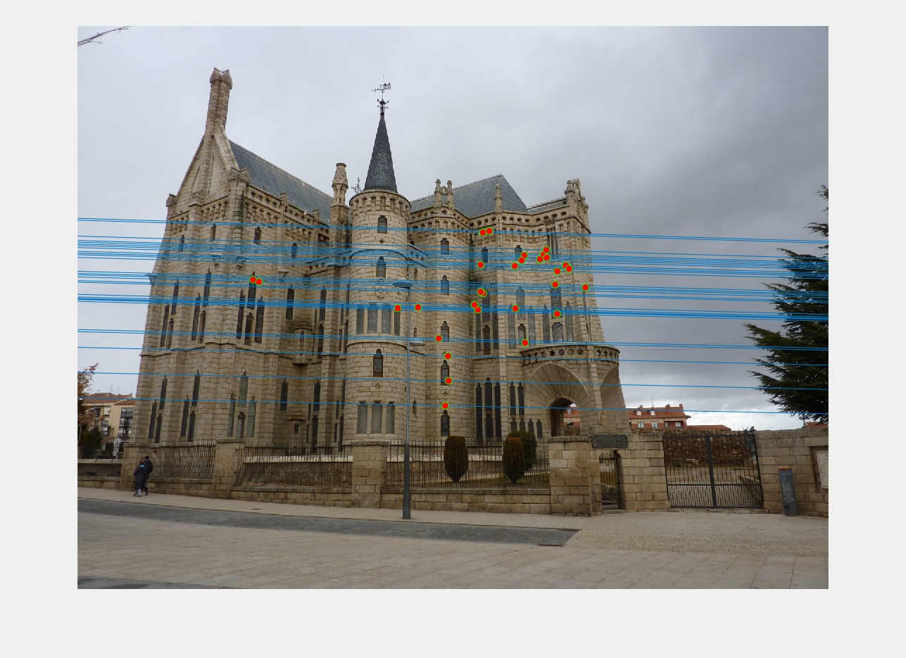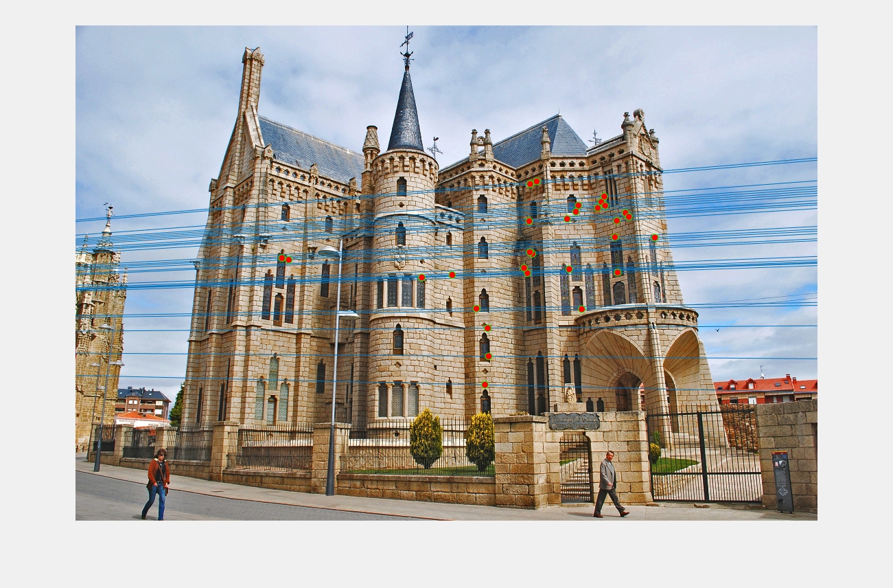 Illustration 8. Epipolar lines drawn on Episcopal Gaudi pair of images (with normalization).