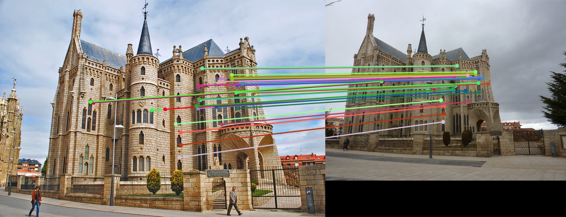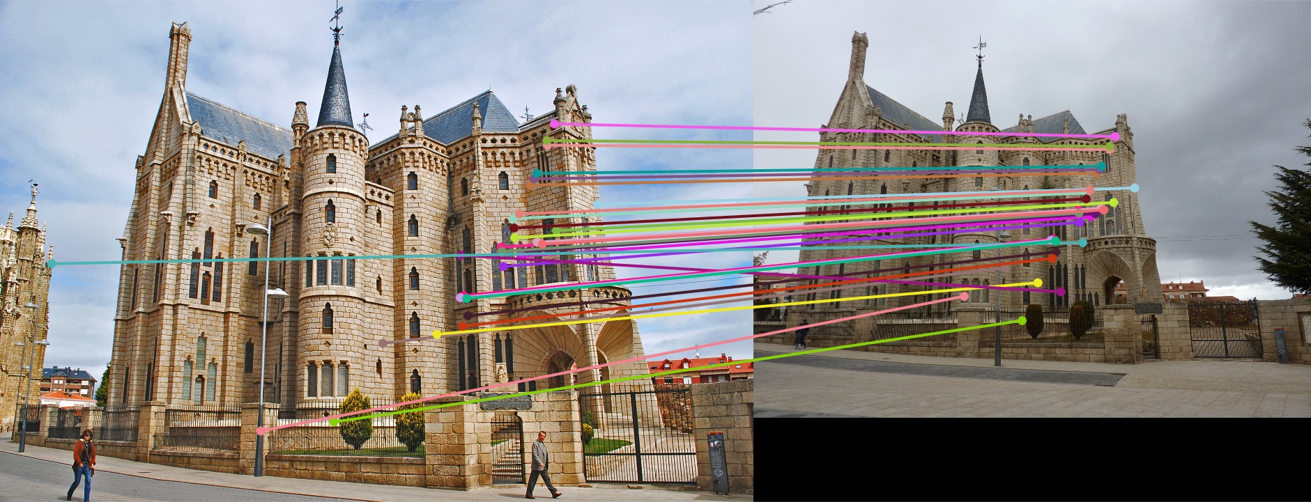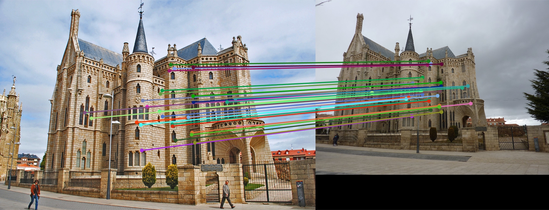 This configuration gives us a high number of inliers: 603. Although I could have decreased the threshold to limit this number, I think that the correspondences shown are mainly correct.