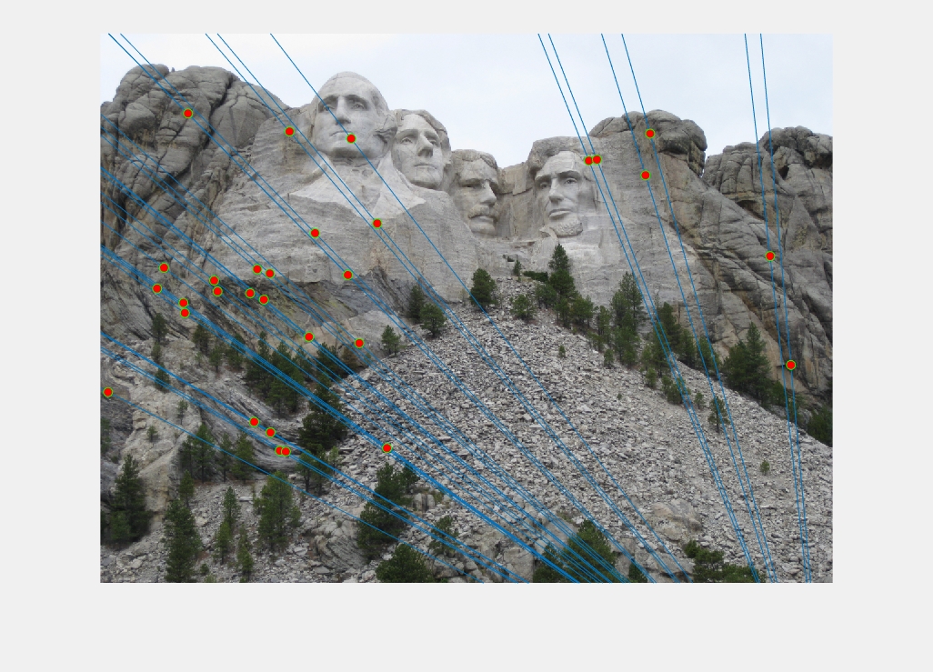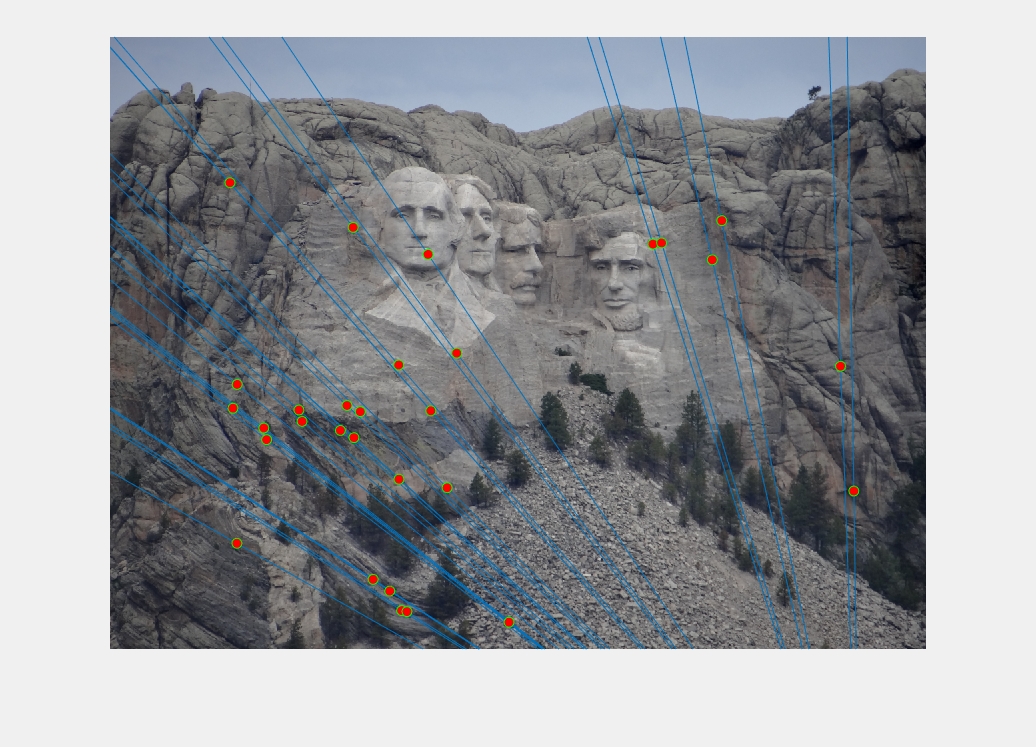 Illustration 5. Epipolar lines drawn on Mountain Rushmore pair of images.