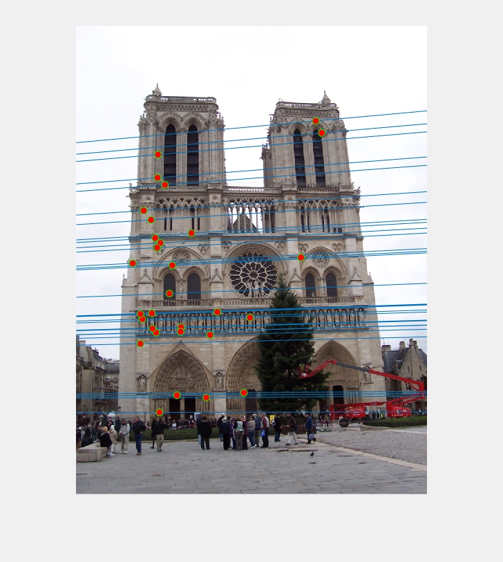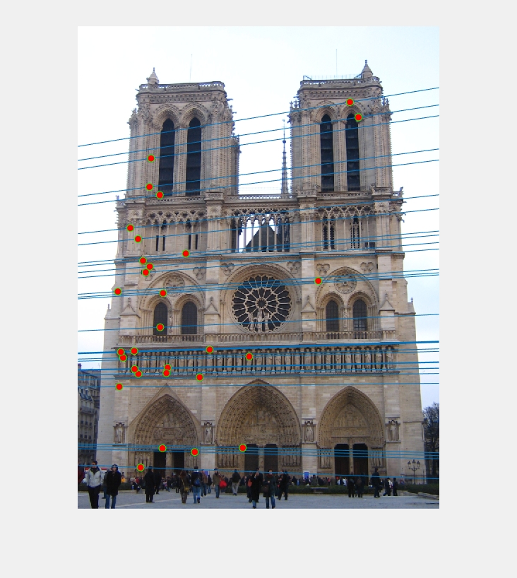 Illustration 6. Epipolar lines drawn on Notre Dame pair of images.