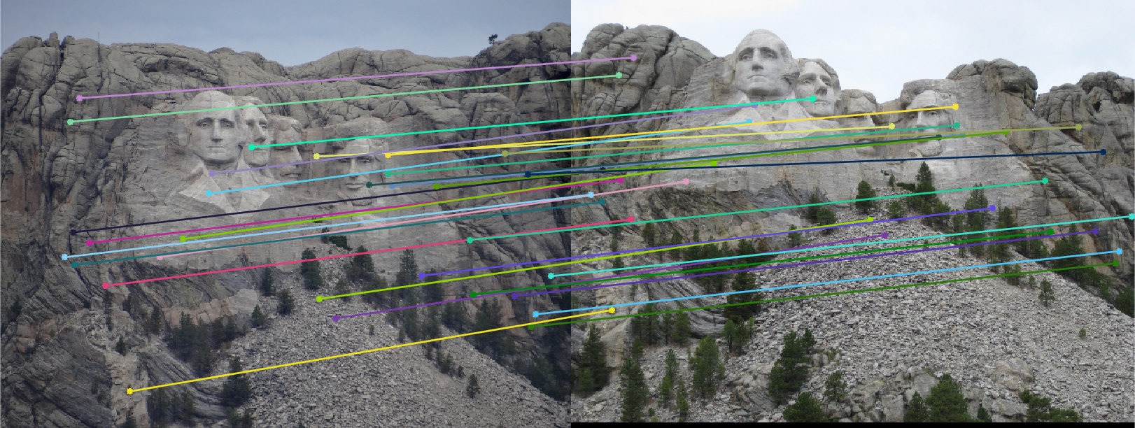 Once the fundamental matrix is calcuated, it is checked with all other interest points using the fundamental matrix equation mentioned in the previous section. Any point that satisfies the equation is known as an inlier. A threshold of 0.05 has been picked by trial and error method to differentiate between inliers and outliers. RANSAC is performed for 3000 iterations and the fundamental matrix with the highest number of inliers is selected as the best fundamental matrix.