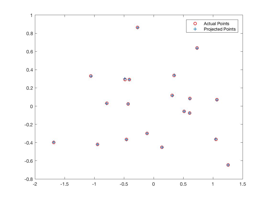 For the unnormalized points I achieved a total residual of 15.545, computed a camera center of <303.1000, 307.1843, 30.4217>, and computed a projection matrix of