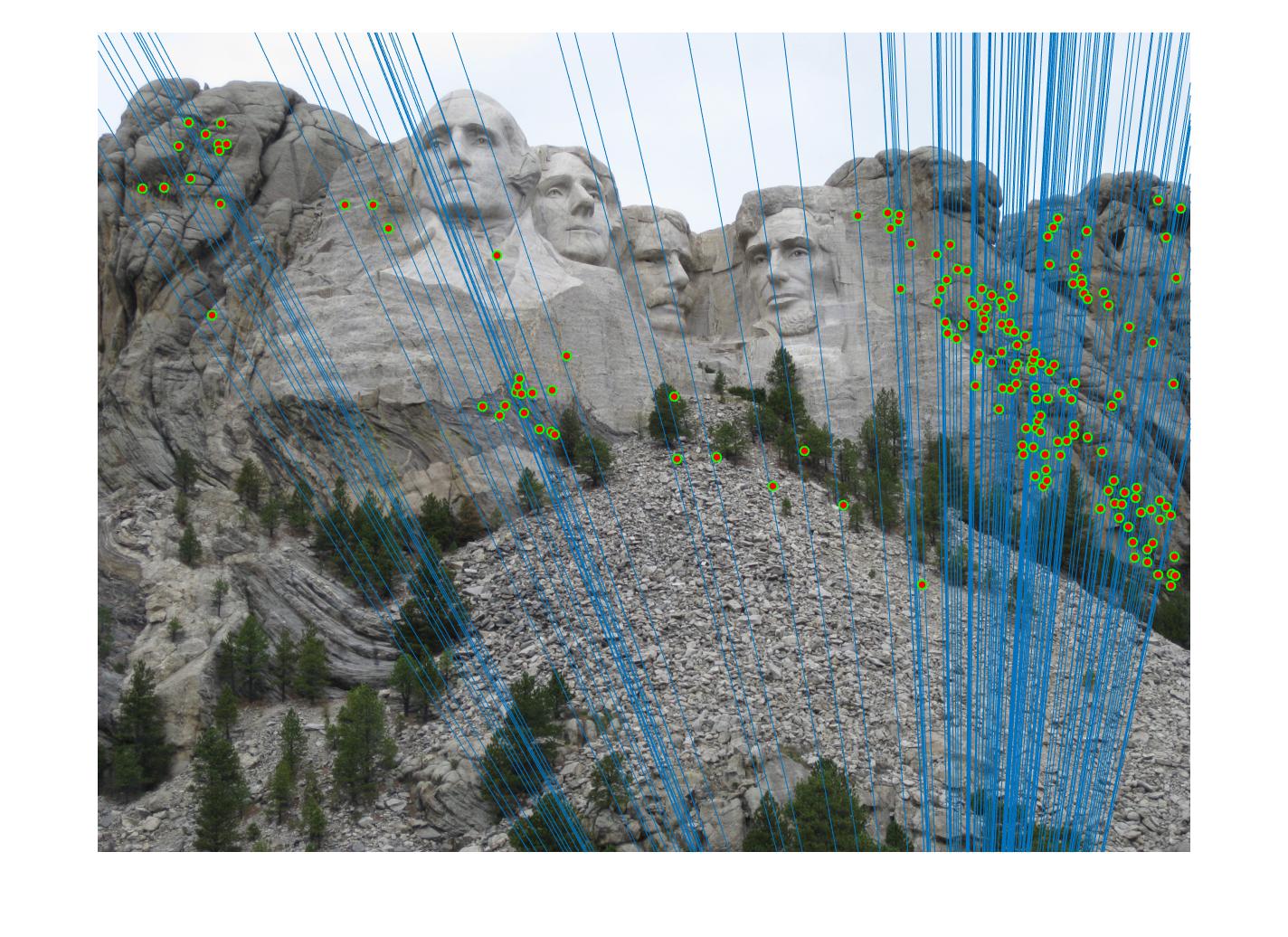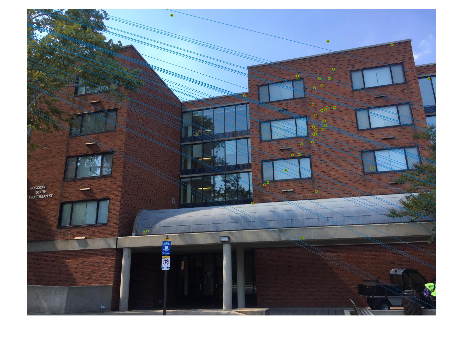In this part we calculate the fundamental matrix, which maps points in one image to lines in another. This requires setting up a matrix similar to the one in the previous part. We use the 8-point algorithm to do solve the matrix. We first setup the matrix using the passed 2D image correspondences. The matrix is set up as: