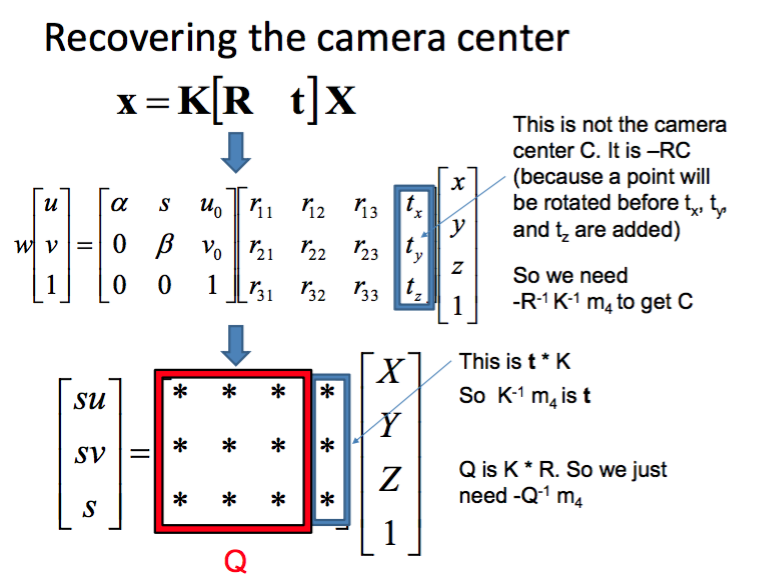 The total residual with the given coordinates was 0.0445, and we can tell that the estimated projection matrix is good enough. Once the projection matrix is computed, computing the camera location is straightforward. Look at the slide 13.pdf page 45. The camera center can be computed as shown in the code below: