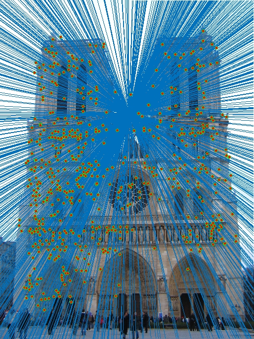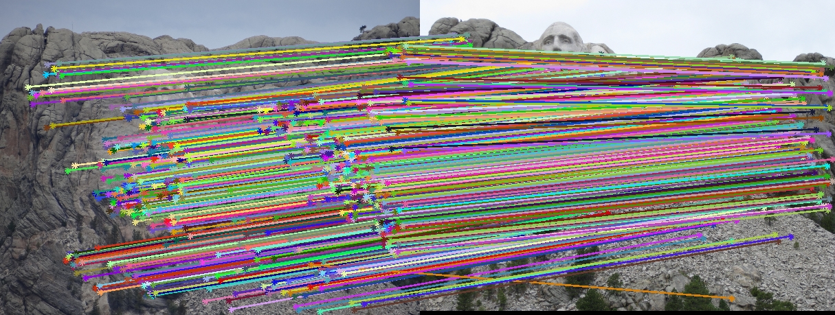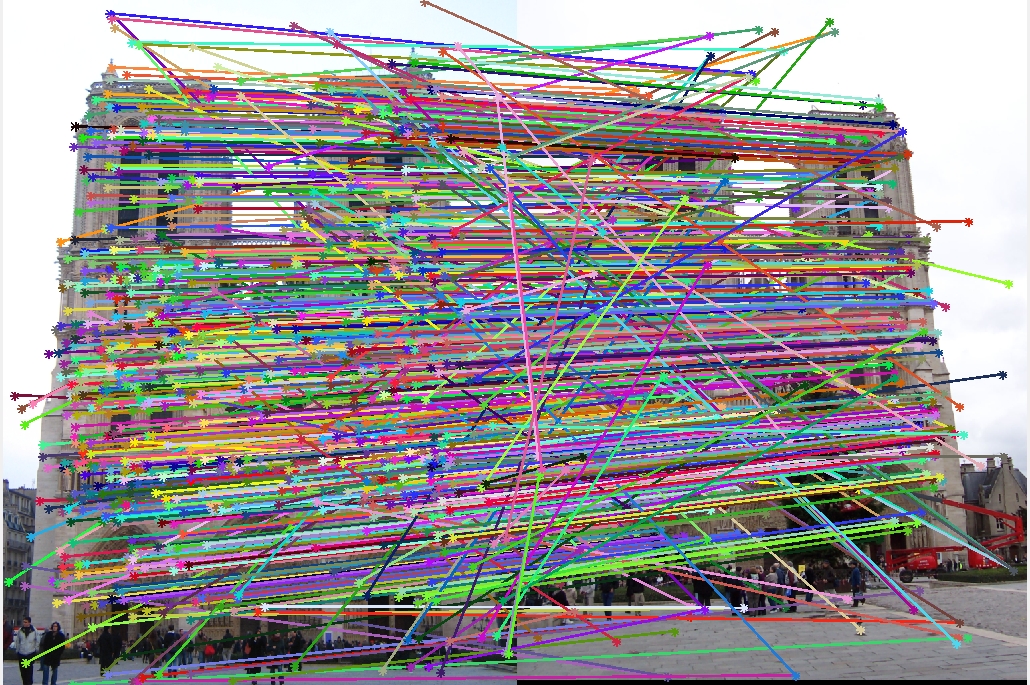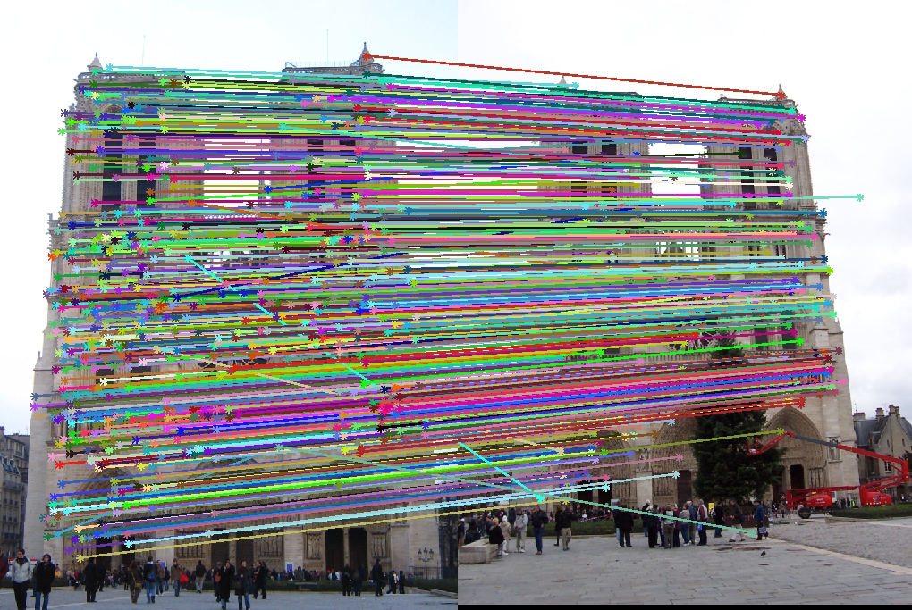 Part 3 derives the fundamental matrix in more realistic sense than Part 2. In Part 2, the corresponding pairs are given, and the fundamental matrix was derived based on these correspondence. However, the correspondence problem is one of the biggest challenges to find a fundamental matrix. Part 3 consists of solving the correspondence problem. Here, the author uses the vl_feat library (http://www.vlfeat.org/matlab/matlab.html) to extract interest points, compute SIFT features, and solve the correspondence problem. This is a fast library, but the accuracy of the matching is not very great. Therefore, the key part of Part 3 is to improve the matching quality using the RANSAC algorithm.