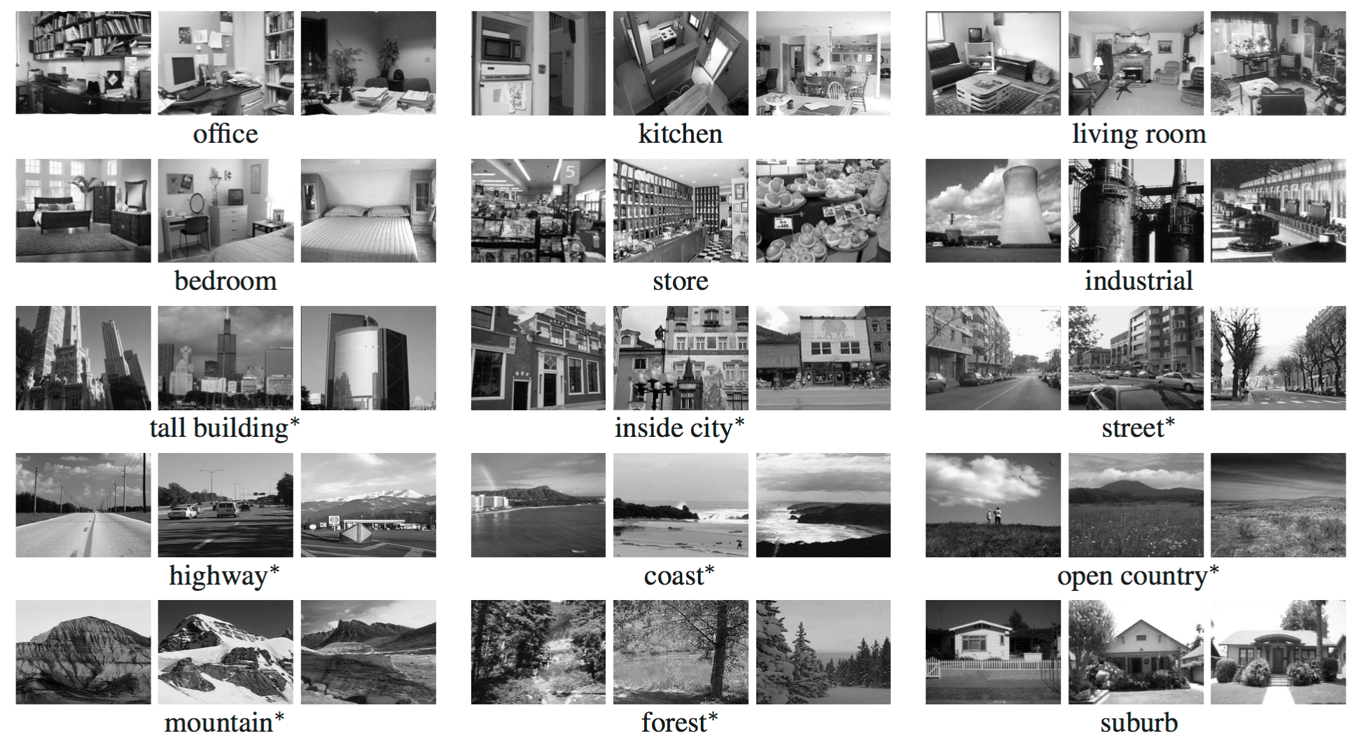 Scene recognition using bag of words used the idea of recognition of real world scenes that bypasses the segmentation and the processing of individual objects or regions. The procedure is based on a very low dimensional representation of the scene. The model generates feature descriptor for each image based on a multidimensional space in which scenes share membership in semantic categories. The initial work in this respect was introduced in 2001 with 8 scene categories. This was then modified to have 13 categories in the work published in 2005, and finally 15 categories later in 2006. In this project we use the 15 categories to perform scene recognition.
