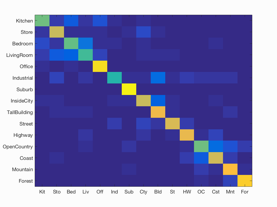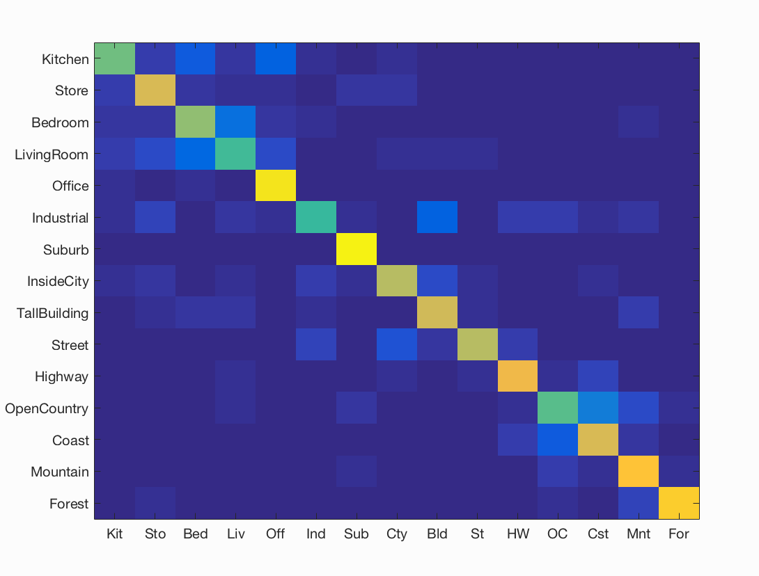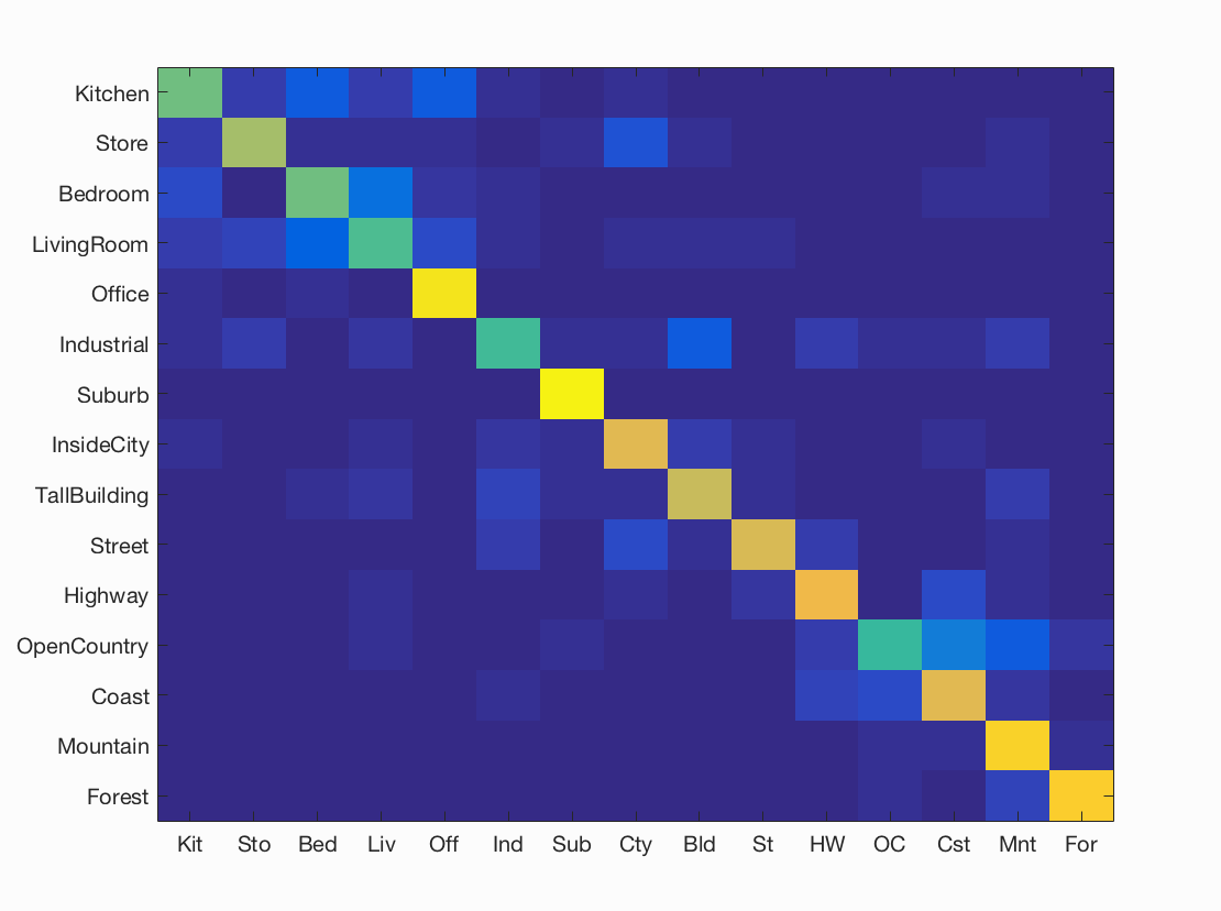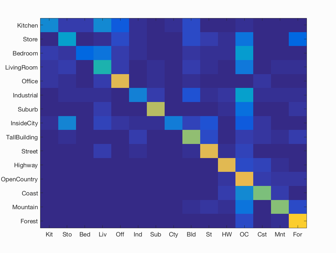 Figure : Confusion matrix for best consistent accuracy = 72.9%% obtained using GMM cluster size 30, sift step size = 6, and lambda = 0.000557.