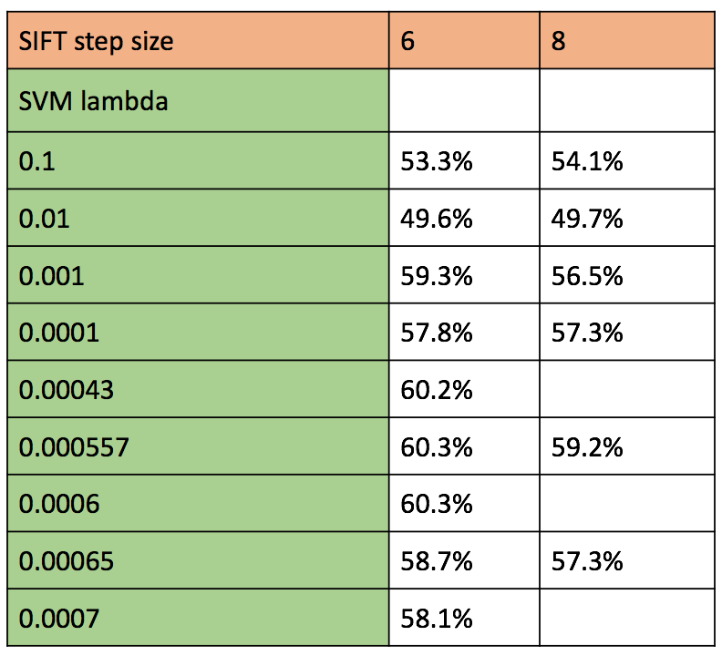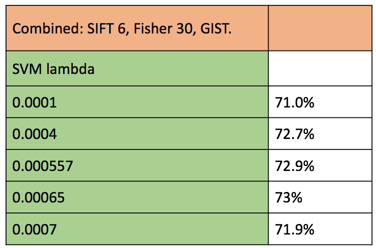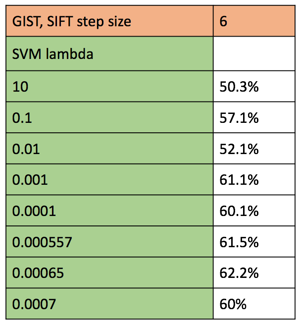 The parameters that we can alter in GIST is number of orientations per scale, number of blocks, and pre filtering. In order to get 128 length feature vector like SIFT, we use a total of 32 scales, 2 blocks, and filter size 4. The other free parameters are those related to linear SVM classification. The cost of miss classified data points within the support vector margin (denoted my lambda) is tuned with values ranging from 10 to 0.00001. A table of accuracies obtained for different combinations of free parameters is shown below.