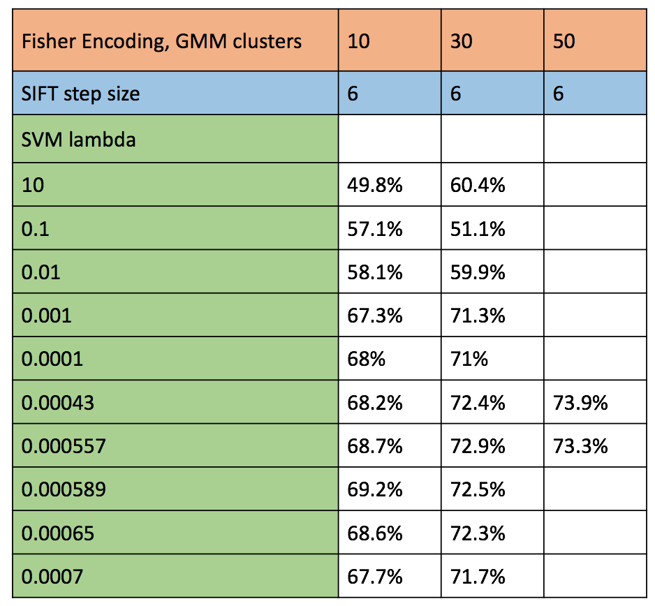 Combination: Fisher Encoding (GMM cluster size 30, SIFT step size 6) with Linear SVM Classification (lambda = 0.000557).