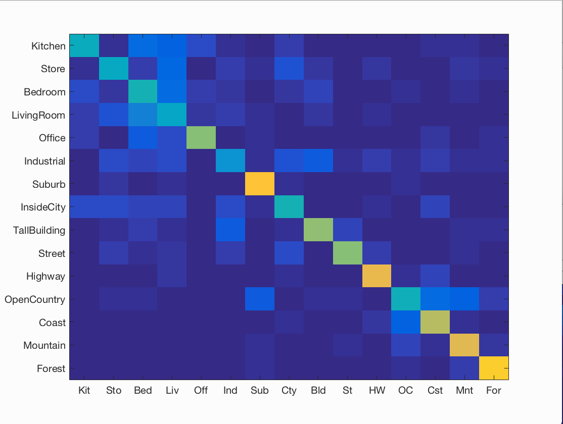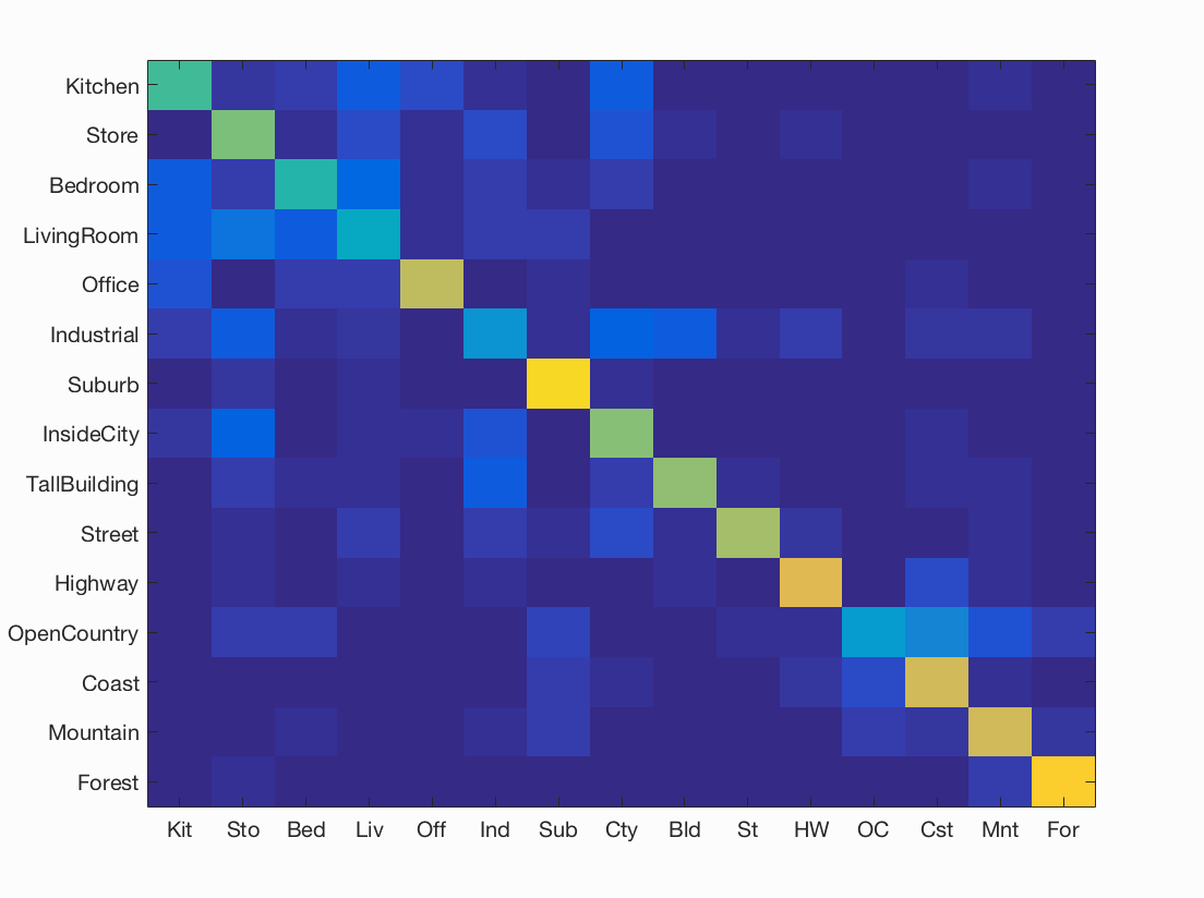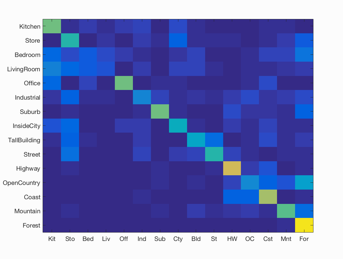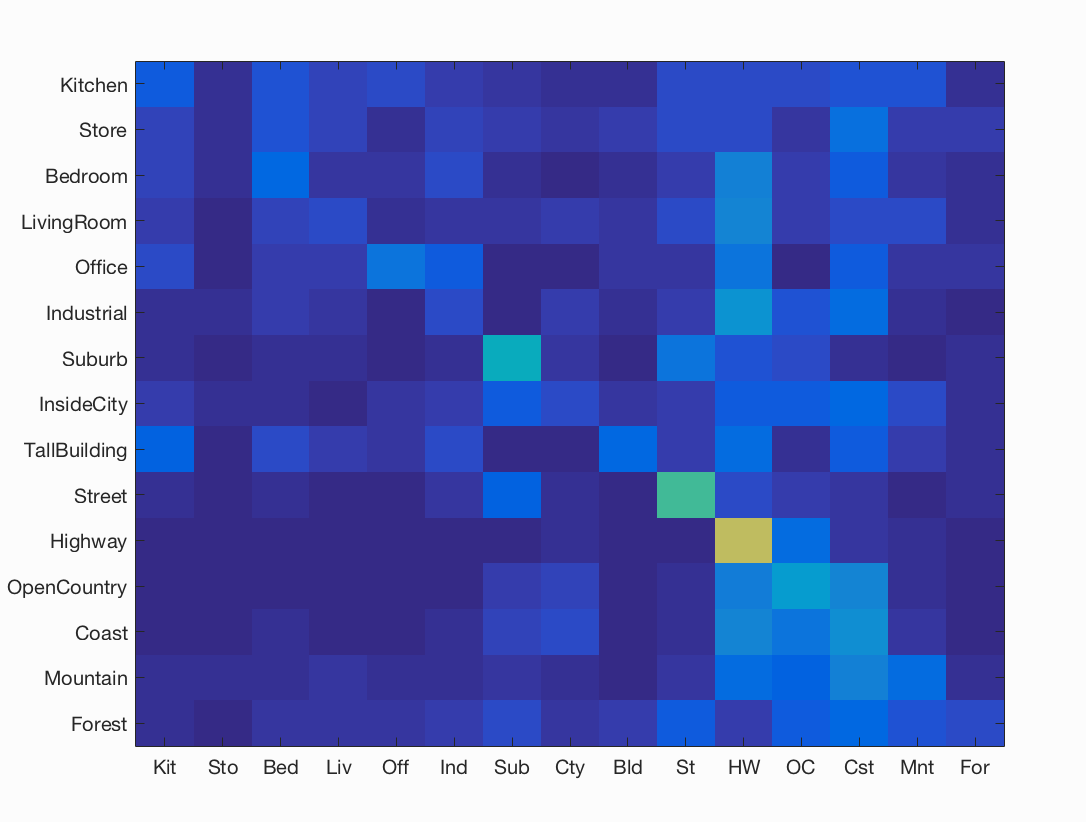 Figure : Confusion matrix for best accuracy = 48% obtained using sift step size = 6, and 7 nearest neighbours.