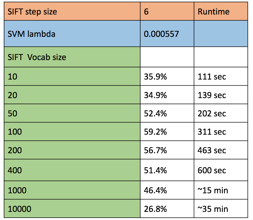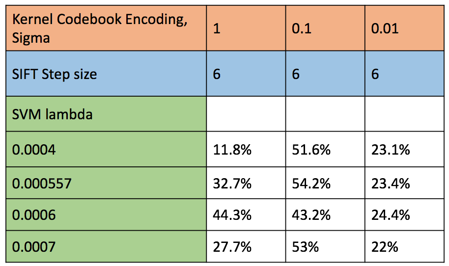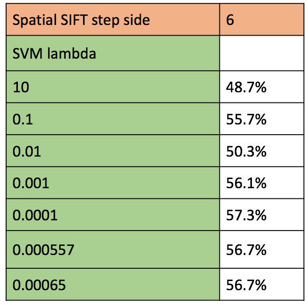 The free parameters in this combination of image descriptor and classifier are the SIFT step size, and lambda which is the regularization parameter that serves as a degree of importance that is given to miss-classifications. We performed the experiment with fast parameter in vl_dsift, and without it. with 'fast' the runtime was much less, and accuracy was slightly better. This may be due to the fact that fast vl_dsift performs denser sift description extraction.