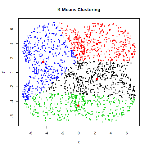 Figure : Example of Kmeans clustering. The red points are means found after clustering.