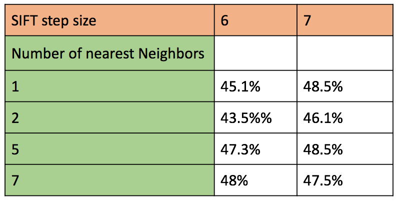 Figure : Accuracy of various combination of parameters for SIFT representation and classification using k-nearest neighbours with k = 5 and k = 8.
