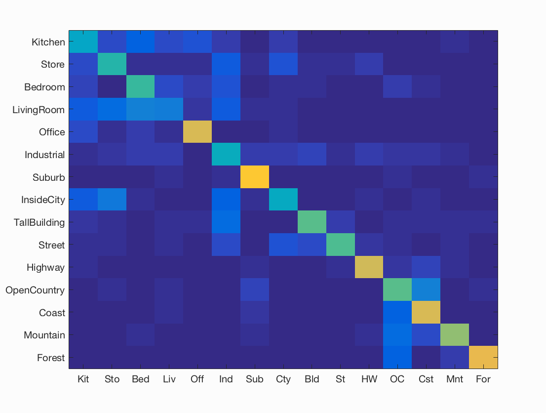 Figure : Confusion matrix for best consistent accuracy = 72.9%% obtained using Fisher encoding of GMM clusters =30, sift step size = 6, and SVM lambda = 0.000557.